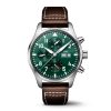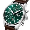Highlights: This Pilot’s Watch Chronograph (ref. IW378005) features a stainless steel case with a diameter of 43mm, a green dial, and rhodium-plated hands. The high-contrast dial with large Arabic numerals and the triangle index marker at 12 o’clock has been designed in the style of an easy-to-read cockpit instrument. Thanks to luminescent elements, the time can be read at a glance, even at night, or in difficult visibility conditions. The IWC-manufactured 69385 caliber, a precise and robust chronograph movement in classic column-wheel design, enables measurement of stop or aggregate times of up to 12 hours. The hours are displayed on the counter at 9 o’clock, the minutes at 12 o’clock. The small second features a red hand and is located at 6 o’clock. The self-winding movement with a power reserve of 46 hours is visible through the sapphire glass back. Water-resistant to 10 bar, the chronograph is fitted on a brown calfskin strap with a pin buckle. Thanks to the integrated EasX-CHANGE® system, the strap can be easily changed without additional tools.