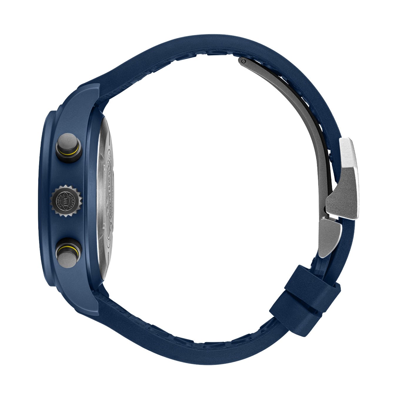 Highlights: Inspired by the military-exclusive watch developed with Blue Angels members in Pensacola, the chronograph features a blue ceramic case. The bright blue color is the result of mixing zirconium oxide with other metallic oxides. Here, too, the chronograph pushers and the crown are made of IWC-developed Ceratanium®. The iconic “Blue Angels®” crest with the U.S. Navy Wings of Gold is at 6 o’clock on the dial; the characteristic lettering is engraved on the titanium case back. Yellow details are provided by the chronograph seconds hand, the small seconds and the day-date display at 3 o’clock. This watch is fitted with a blue rubber strap with textile inlay.