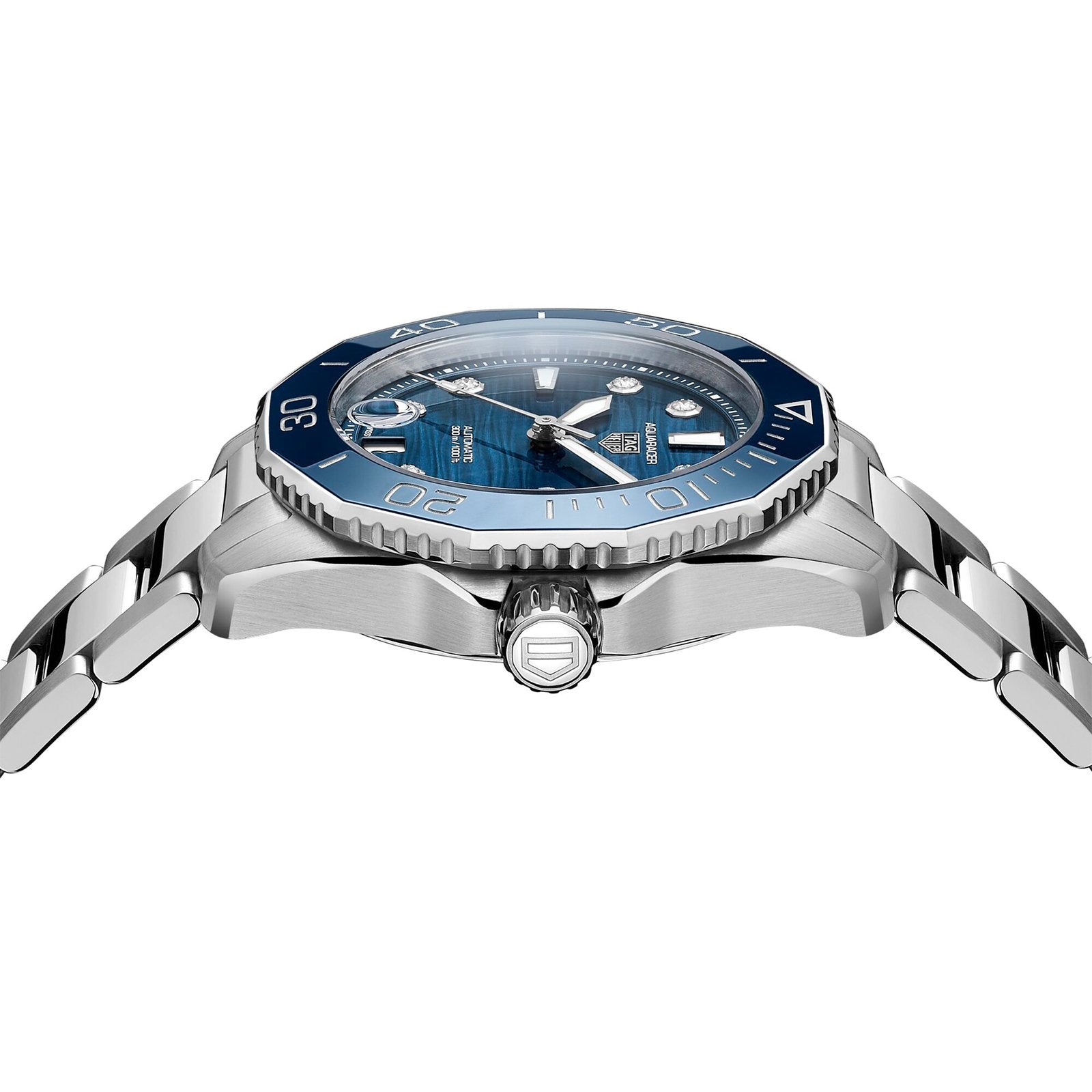 dive watch. An exciting, blue-lacquered dial with wavy finishing matches the unidirectional ceramic bezel, with eight VS diamonds (0.078ct) highlighting its elegance. Raising the bar for versatility, a new 36mm slim case blends sporty looks, robust design, and sharp geometry. A Heavy-duty watch, water-resistant to 300 meters, with a tapered steel bracelet secured by safety push buttons on the buckle, and a fine adjustment system.