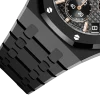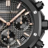 Black dial with “Grande Tapisserie” pattern, black counters, pink gold applied hour-markers and Royal Oak hands with luminescent coating.