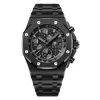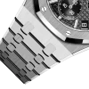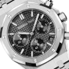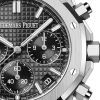 Black dial with “Grande Tapisserie” pattern, black counters, white gold applied hour-markers and Royal Oak hands with luminescent coating.