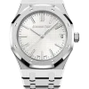 Silver-toned dial with “Grande Tapisserie” pattern, white gold applied hour-markers and Royal Oak hands with luminescent coating.