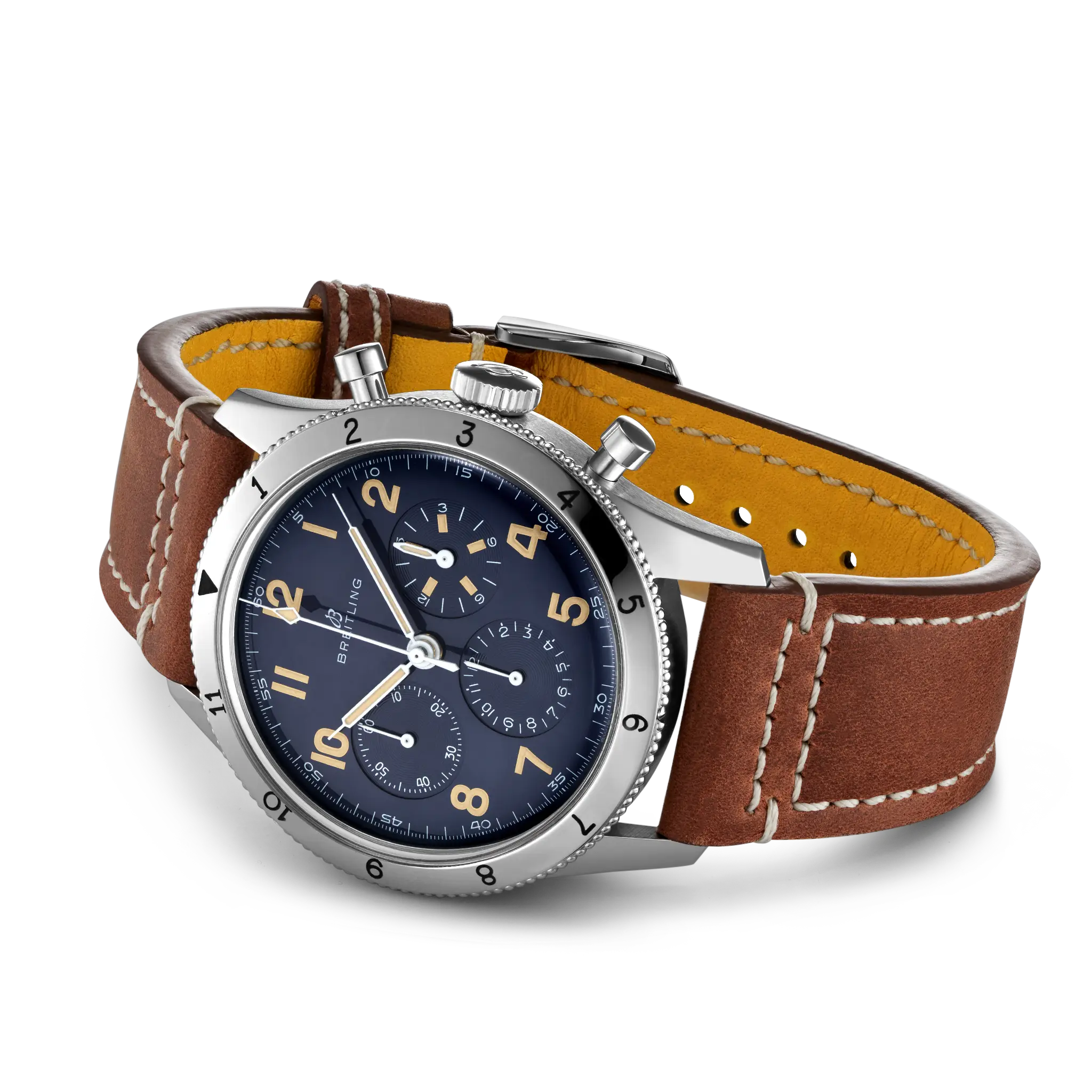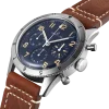 The platinum case and bezel of the Breitling Aviator 8 Avi 1953 Platinum Men’s Watch LB0920131C1X1 have a polished finish, complemented by a vintage-style brown leather strap. On the black dial, you’ll find Arabic numeral hour markers and a chronograph, inspired by the original Co-Pilot Ref. 765 AVI launched in 1953. This re-edition is a must-have for those passionate about aviation, radiating undeniable luxury.