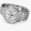 Silver-tone stainless steel case and bracelet. Bi-directional rotating gold-tone stainless steel bezel. Beige dial with blued hands and index-Arabic numeral hour markers. Minute markers around the outer rim. Dial Type: Analog. Luminescent hands and markers. Date display at the 6 o’clock position. Chronograph – three sub-dials displaying: 60 second, 30 minute and 1/10th of a second. Breitling Calibre 01 Automatic movement, containing 47 Jewels, composed of 346 parts, bitting at 28800 vph, and has a power reserve of approximately 70 hours. Scratch resistant sapphire crystal. Screw down crown. Round case shape, case size: 41 mm, case thickness: 13.6 mm. Fold over clasp with a safety release. Water resistant at 30 meters / 100 feet. Functions: chronograph, date, hour, minute, second.