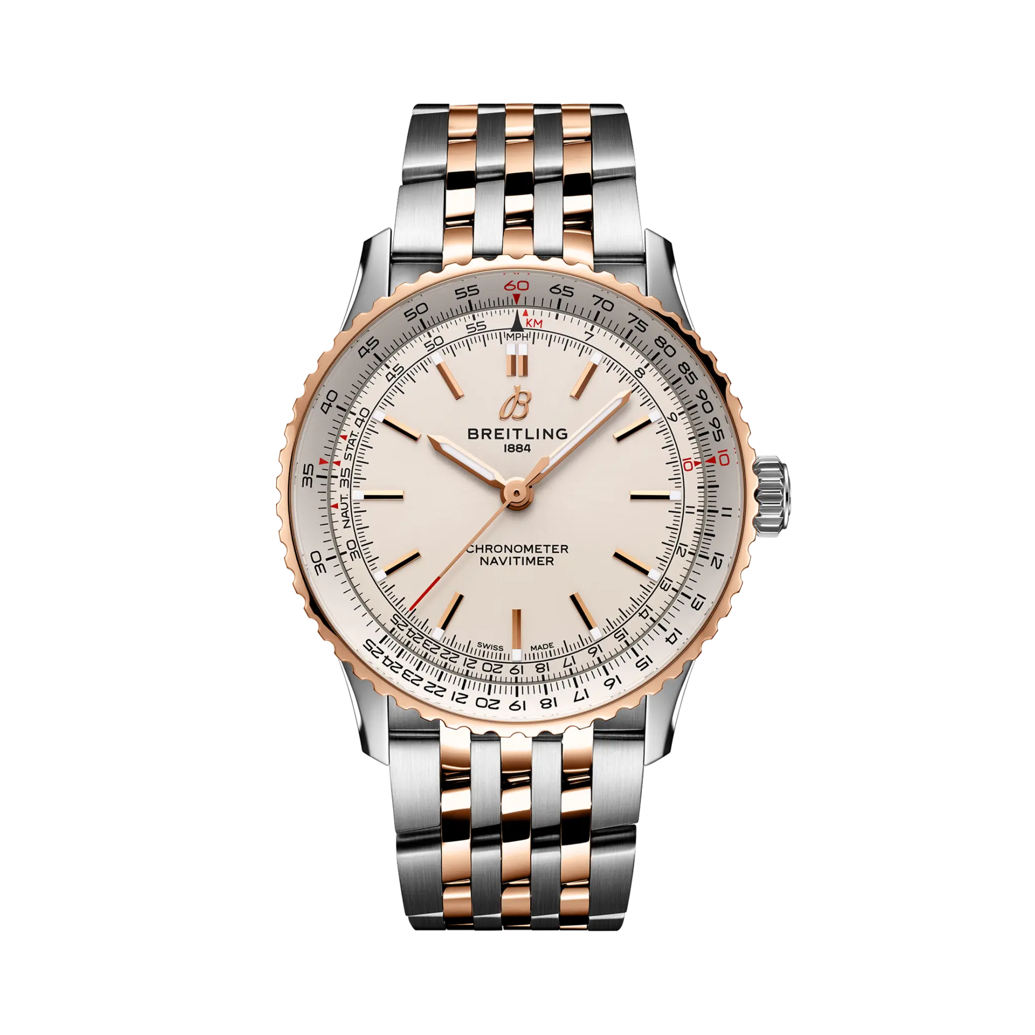 Experience timeless elegance with the Breitling Navitimer Automatic 41 U17329F41G1U1. This exquisite timepiece features a sleek silver dial accented by index hour markers and a slide rule for added functionality. The 41mm stainless steel case is complemented by an 18k rose gold notched bezel, combining luxury with durability. The steel bracelet with deployment buckle ensures a comfortable fit for everyday wear. Equipped with automatic movement and certified as a chronometer, this watch seamlessly blends style and precision. Elevate your look with the sophisticated charm of the Breitling Navitimer Automatic 41.
