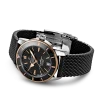 This Breitling Superocean Heritage II B20 Automatic 42 men’s watch features a polished stainless steel case and an ultra-hard, scratch-resistant black high-tech unidirectional rotating ceramic bezel. It comes with a black rubber Aero Classic strap and boasts luminescent minute and hour hands, along with luminescent dots at the ends of the index hour markers and a luminescent dot at the 12 o’clock position on the bezel. The dial is a sophisticated black color called “volcano black” and displays the date at 6 o’clock. Powered by the Breitling Caliber B20 self-winding automatic chronometer certified movement, this watch has an impressive 70 hour power reserve and beats at 28,800 vph with 28 jewels.