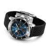“The Breitling Superocean Heritage II B01 Chronograph 44 AB0162121C1S1 is a men’s watch featuring a polished stainless steel case, black unidirectional rotating bezel, and Aero Classic black rubber strap. The blue dial includes luminescent minute and hour hands, as well as dots at the index hour markers and 12 o’clock on the bezel. A date aperture is located between 4 and 5 o’clock, and the chronograph functions include a central seconds hand, 30 minute counter sub-dial at 3 o’clock, and 12 hour counter sub-dial at 6 o’clock. It is powered by the Breitling Caliber 01 self-winding automatic chronometer certified movement with a 70-hour power reserve and 47 jewels.
