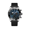 “The Breitling Superocean Heritage II B01 Chronograph 44 AB0162121C1S1 is a men’s watch featuring a polished stainless steel case, black unidirectional rotating bezel, and Aero Classic black rubber strap. The blue dial includes luminescent minute and hour hands, as well as dots at the index hour markers and 12 o’clock on the bezel. A date aperture is located between 4 and 5 o’clock, and the chronograph functions include a central seconds hand, 30 minute counter sub-dial at 3 o’clock, and 12 hour counter sub-dial at 6 o’clock. It is powered by the Breitling Caliber 01 self-winding automatic chronometer certified movement with a 70-hour power reserve and 47 jewels.