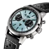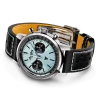 Silver-tone stainless steel case with a black calfskin leather strap. Fixed silver-tone stainless steel bezel. Ice blue dial with silver-tone hands and index hour markers. Minute markers around the outer rim. Dial Type: Analog. Luminescent hands and markers. Chronograph – two sub-dials displaying: 60 second and 30 minute. Breitling Calibre 01 (TECH-205) automatic movement with a 70-hour power reserve. Scratch resistant sapphire crystal. Pull / push crown. Transparent case back. Round case shape, case size: 41 mm, case thickness: 13.3 mm. Band width: 20 mm. Folding clasp. Water resistant at 100 meters / 330 feet. Functions: chronograph, hour, minute, second, chronometre. Top Time B01 Triumph Series. Sport watch style. Watch label: Swiss Made. Breitling Top Time B01 Triumph Chronograph Automatic Ice Blue Dial Men’s Watch AB01764A1C1X1.