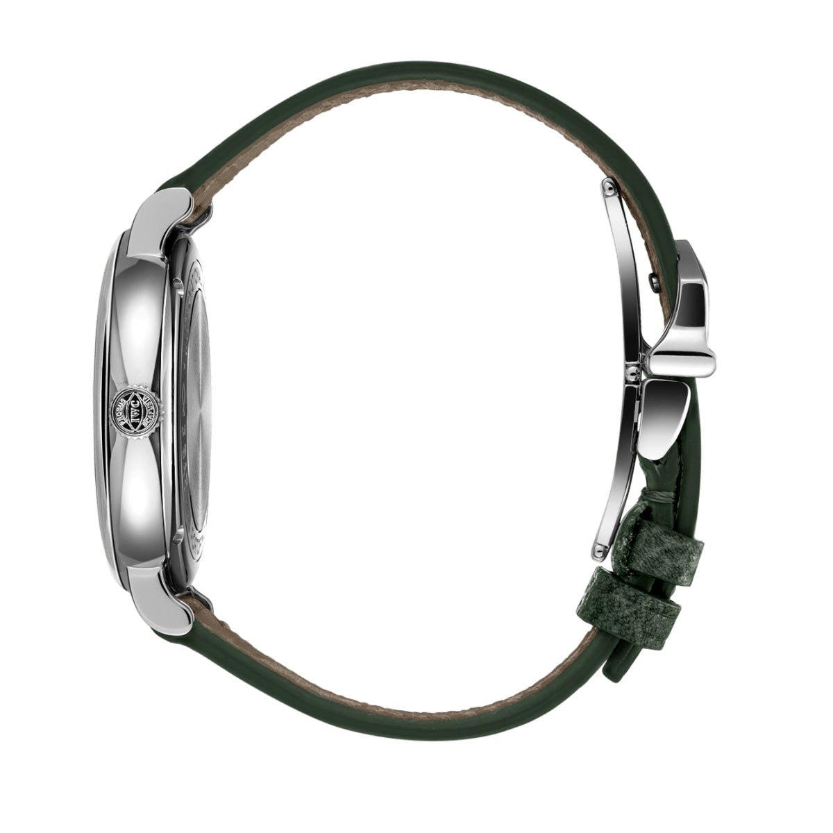 Highlights:Â Rhodium-plated hour markers, Roman numerals at 6 and 12 o’clock, and slender feuille hands provide a delightful contrast to the rich green dial, on which twelve bright white diamonds mark the hours. This casually elegant ladies’ watch is fitted with a green calfskin strap with a butterfly clasp. Thanks to the integrated quick-change system, the strap can be changed in no time, allowing the timepiece to be adapted to different outfits or situations.