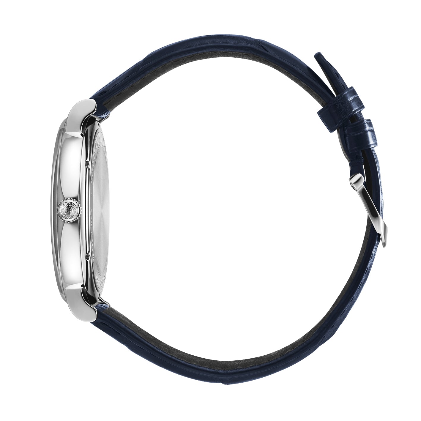 - Presented in a 40mm stainless steel case and secured by a blue leather strap