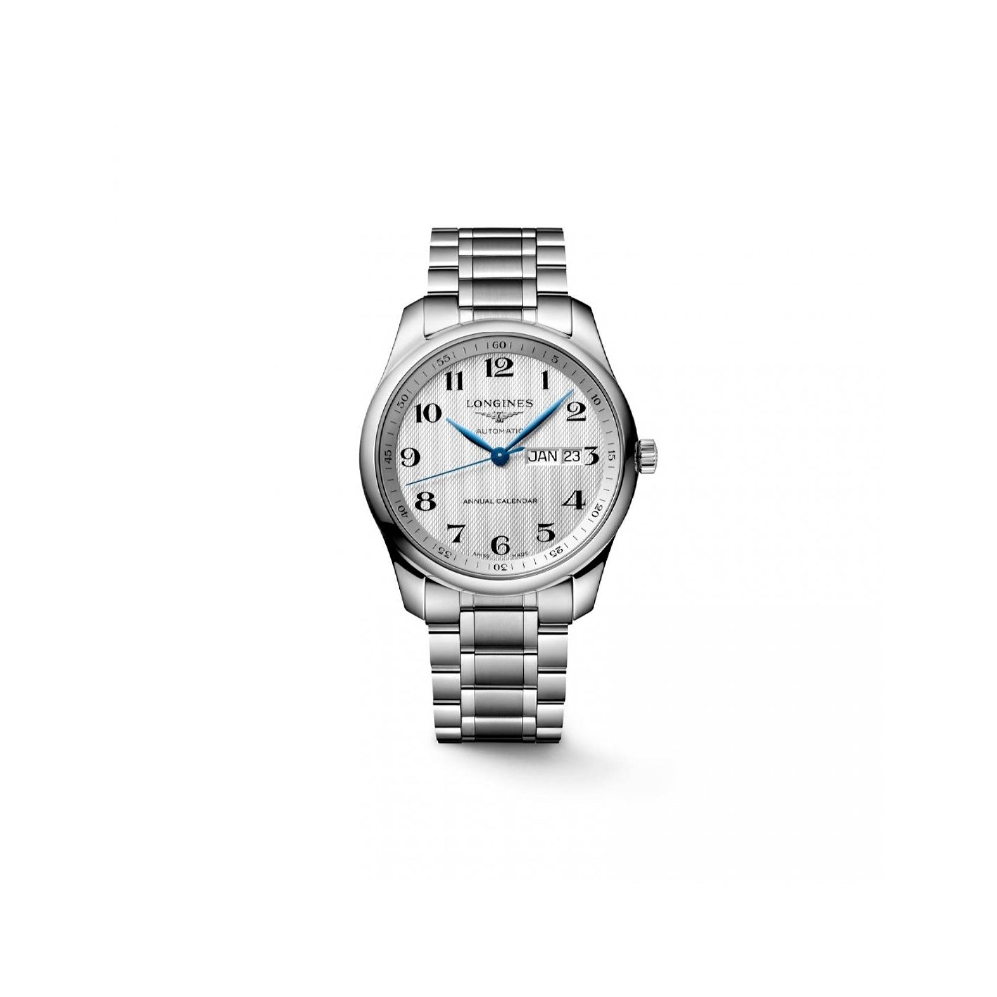 stainless steel Bracelet. stainless steel case. silver-tone stainless steel bezel. silver dial with Blue hands and Arabic Numerals hour markers. . automatic movement. sapphire crystal. 40mmx 40mmx 9.5mm case. 21mm band width. 30 meter water resistant. L2.910.4.78.6