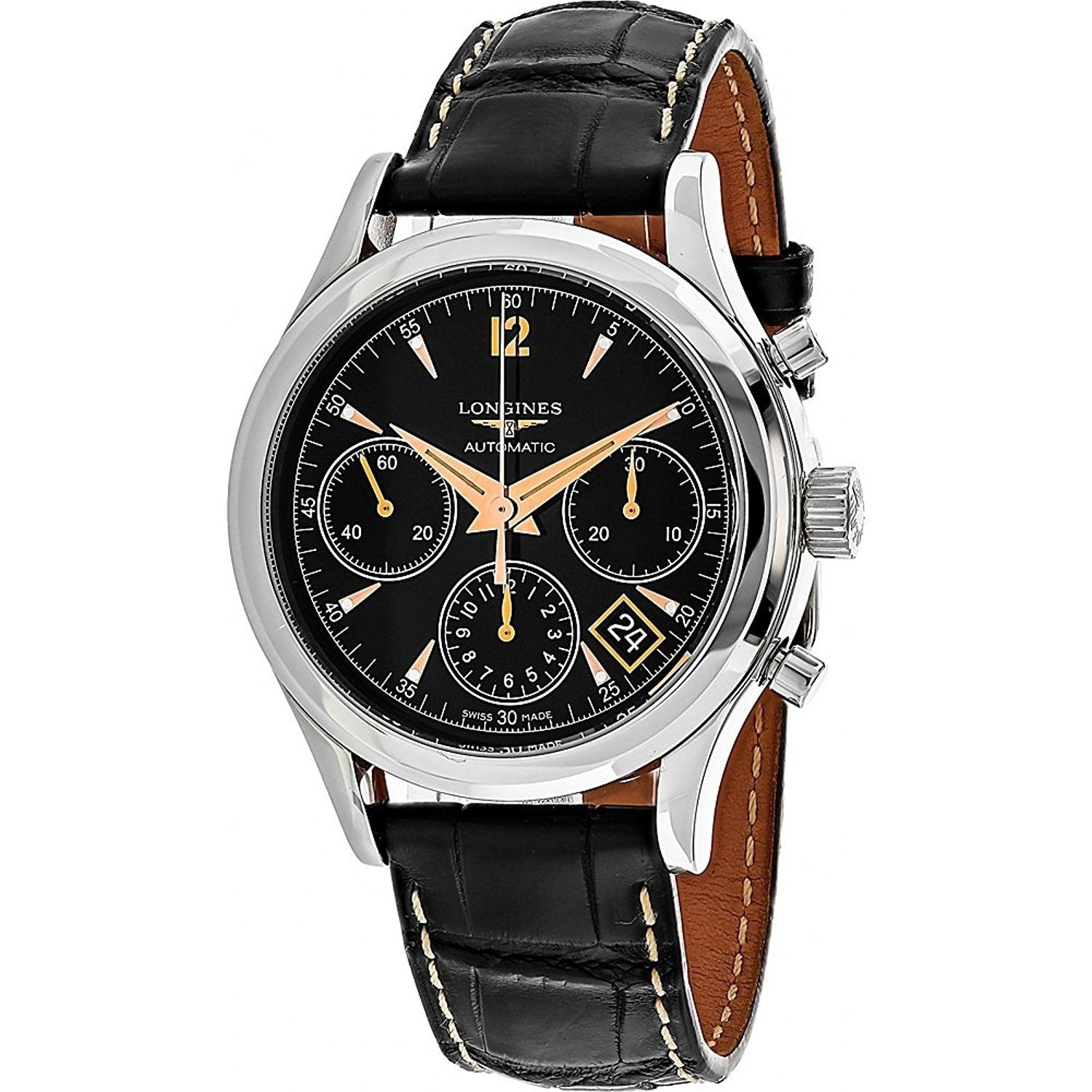 black leather Strap. stainless steel case. stainless steel bezel. black dial with Rose-Tone hands and Rose-Tone Index hour markers. chronograph automatic. automatic movement. sapphire crystal. 39mmx 39mmx 15mm case. 18mm band width. 30 meters water resistant. L27424560