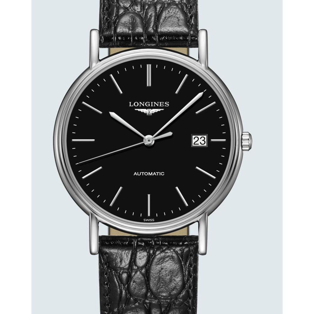 Strap. case. bezel. dial with Silver hands and Index hour markers. . movement. crystal. 38.5mmx 38.5mmx 8.3mm case. 20mm band width. water resistant. L4.921.4.52.2