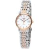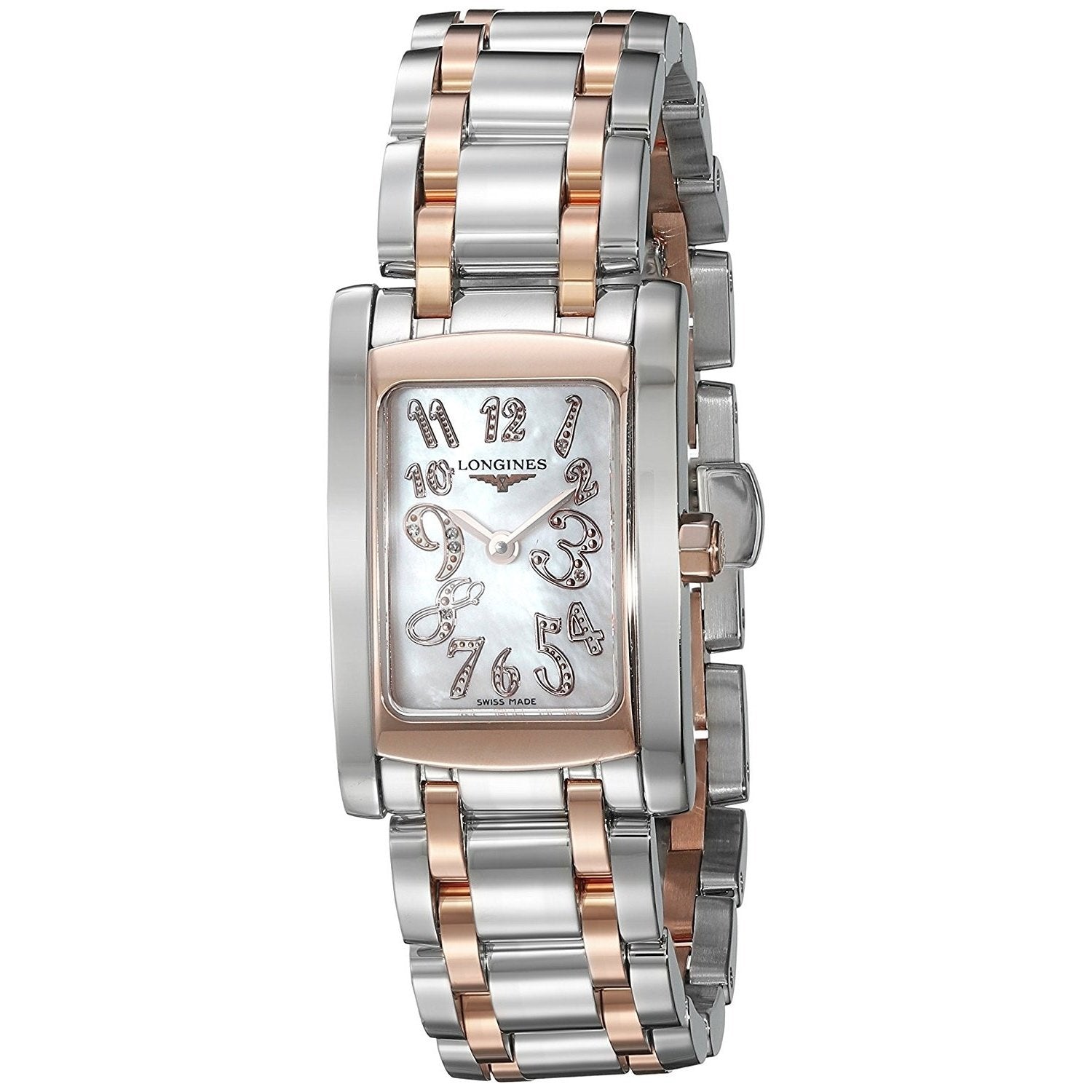 two-tone stainless steel Bracelet. stainless steel case. stainless steel bezel. mother of pearl dial with Silver hands and Rose-Tone Arabic numeral diamonds hour markers. 18kt pink gold diamond. quartz movement. sapphire crystal. 20mmx 20mmx 7mm case. 14mm band width. 30 meters water resistant. L51555977