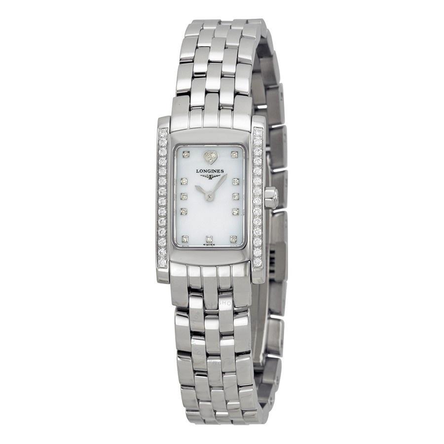 stainless steel Bracelet. stainless steel case. stainless steel set with diamonds bezel. mother of pearl dial with Silver hands and Diamonds hour markers. diamond. quartz movement. sapphire crystal. 16mmx 20mmx 5mm case. 13mm band width. 30 meters water resistant. L51580926