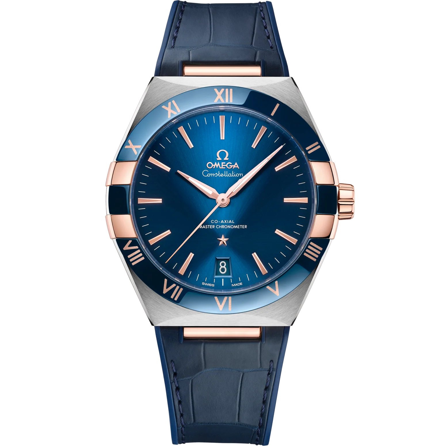 Unworn Omega Constellation CO‑AXIAL MASTER CHRONOMETER 131.23.41.21.03.001. 41 mm, Blue dial, Steel ‑ Sedna™ Gold case, Blue ceramic bezel, 8900 calibre, Automatic Movement, 60 hours power reserve, Leather strap Foldover clasp. Water resistant to 50 m.