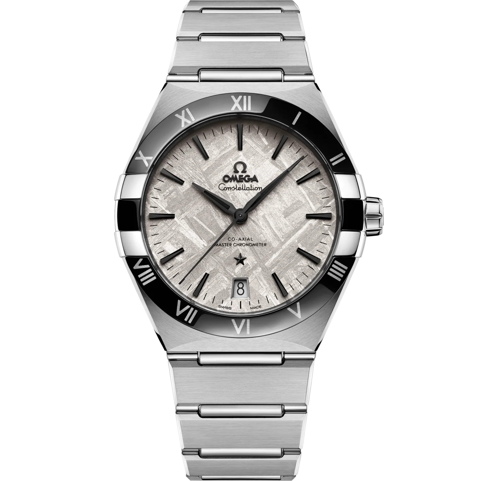 The astonishing dial is formed from a genuine piece of the Muonionalusta meteorite, which fell to the earth in northern Scandinavia (west of the border between Sweden and Finland) in approximately one million years BCE, and was discovered by geologists in 1906. In preparation to be transformed into a unique watch dial, each piece of iron meteorite has been given a rhodium-grey galvanic color treatment, and since the natural pattern within the meteorite is unique to each slice, no two dials are ever the same. This watch is completed with a date window and the signature Omega Constellation star at 6:00.