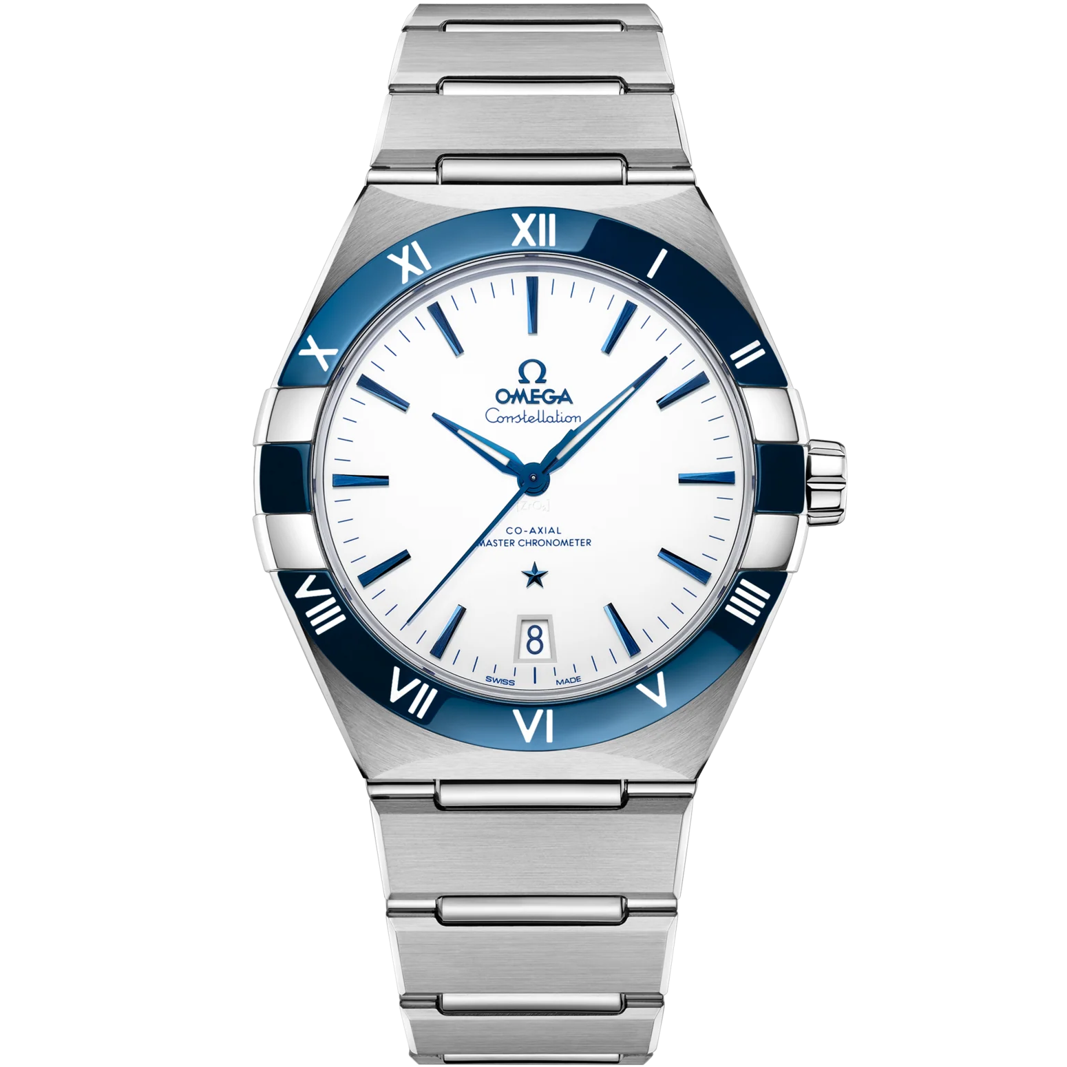 Omega Constellation Co-Axial Master Chronometer 41mm Mens 131.30.41.21.04.001. This exquisite watch features a brushed and polished stainless steel case paired with a striking blue polished ceramic bezel that showcases white grand feu enamel-filled Roman numerals. The pristine white ceramic dial is adorned with blued hands, including luminous-filled hour and minute hands for enhanced visibility, and applied faceted blued index hour markers. A finely printed minutes and seconds track complements the design, while a convenient date window at 3 o’clock adds functionality. Powering this timepiece is the Omega Caliber 8900 movement, which beats at 25,200 vibrations per hour, contains 39 jewels, and offers an impressive approximate power reserve of 60 hours. As a METAS Certified Master Chronometer, it has undergone rigorous testing for water resistance, precision, and resistance to magnetic fields greater than 15,000 gauss. Additionally, it features Omega’s free-sprung balance, Si14 silicon balance spring, and Co-Axial Escapement, while the rotor and visible bridges are elegantly finished with a unique arabesque wave design.