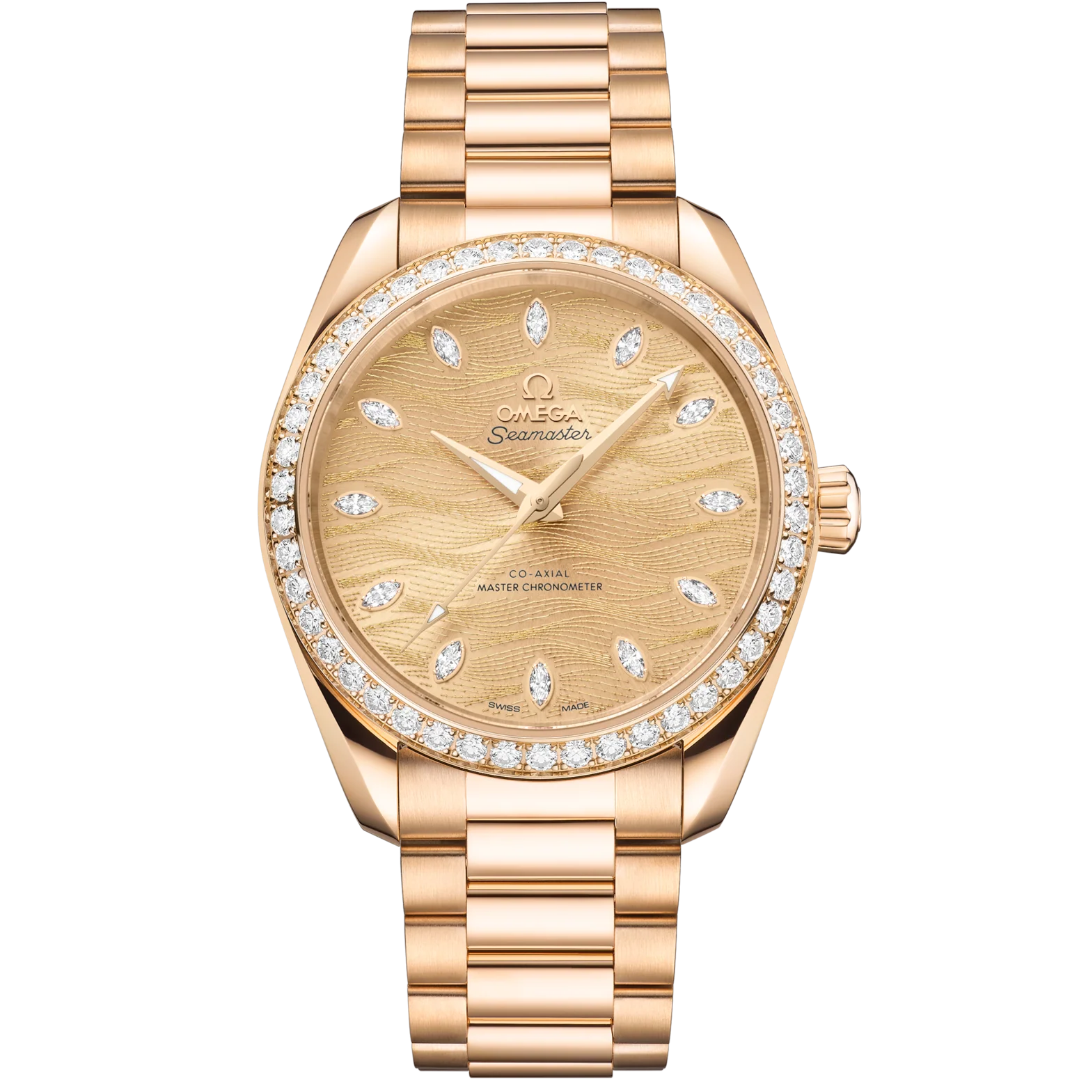 Unworn Omega Seamaster AQUA TERRA 150M CO‑AXIAL MASTER CHRONOMETER 220.55.34.20.99.002. 34 mm, White dial, Sedna™ Gold case, Sedna™ Gold bezel, 8807 calibre, Self Winding Movement, 55 Hours power reserve, Sedna™ Gold bracelet with Butterfly clasp. Water resistant to 150 m.
