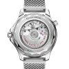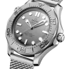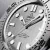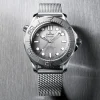 A bold evolution of a modern classic, the OMEGA Seamaster Diver 300M, embodied in the model Ref# 210.30.42.20.06.002 continues its storied journey beneath the waves—this time with a sleek, contemporary twist on its iconic design. First launched in 1993, the Diver 300M has become a symbol of precision, durability, and style, and its latest incarnation carries that legacy forward with masterful refinement. This 42 mm model is crafted from stainless steel and features a striking grade 5 titanium bezel, showcasing a laser-ablated diving scale in positive relief, with a single luminous dot of white Super-LumiNova at 12 o’clock—a nod to professional dive watch functionality and clarity in low-light conditions. The brushed dial, forged from PVD stainless steel, adds a subtle, industrial sophistication, complemented by polished, skeletonized hands and indexes that are filled with white Super-LumiNova for enhanced legibility. Finishing touches, including the OMEGA logo and dial markings, are crisply transferred in black, creating a compelling contrast. Crafted for the depths and designed for clarity, this timepiece is equipped with a domed, scratch-resistant sapphire crystal, offering exceptional durability while maintaining a pristine view of the dial. The crystal also features an anti-reflective coating on the inner surface, minimizing glare and enhancing legibility in all lighting conditions. A helium release valve is seamlessly integrated into the case, ensuring the watch remains uncompromised during professional saturation dives. This essential feature protects the integrity of the timepiece under extreme pressure, making it a true companion for deep-sea explorers. Beneath the surface, the watch is powered by the OMEGA Co-Axial Master Chronometer Calibre 8806 with beating at 25,200 vph, with 35 jewels and a 55-hour power reserve, visible through the sapphire-crystal caseback and certified for outstanding precision, magnetic resistance, and performance by METAS. Completing the look is a Stainless steel brushed mesh bracelet with secure Stainless steel Foldover clasp, merging classic dive-watch heritage with a modern, ergonomic feel. Built for precision, designed for adventure and comfortable for everyday wear, the Seamaster Diver 300M, water resistant to 300 meters, remains a legend in every sense.