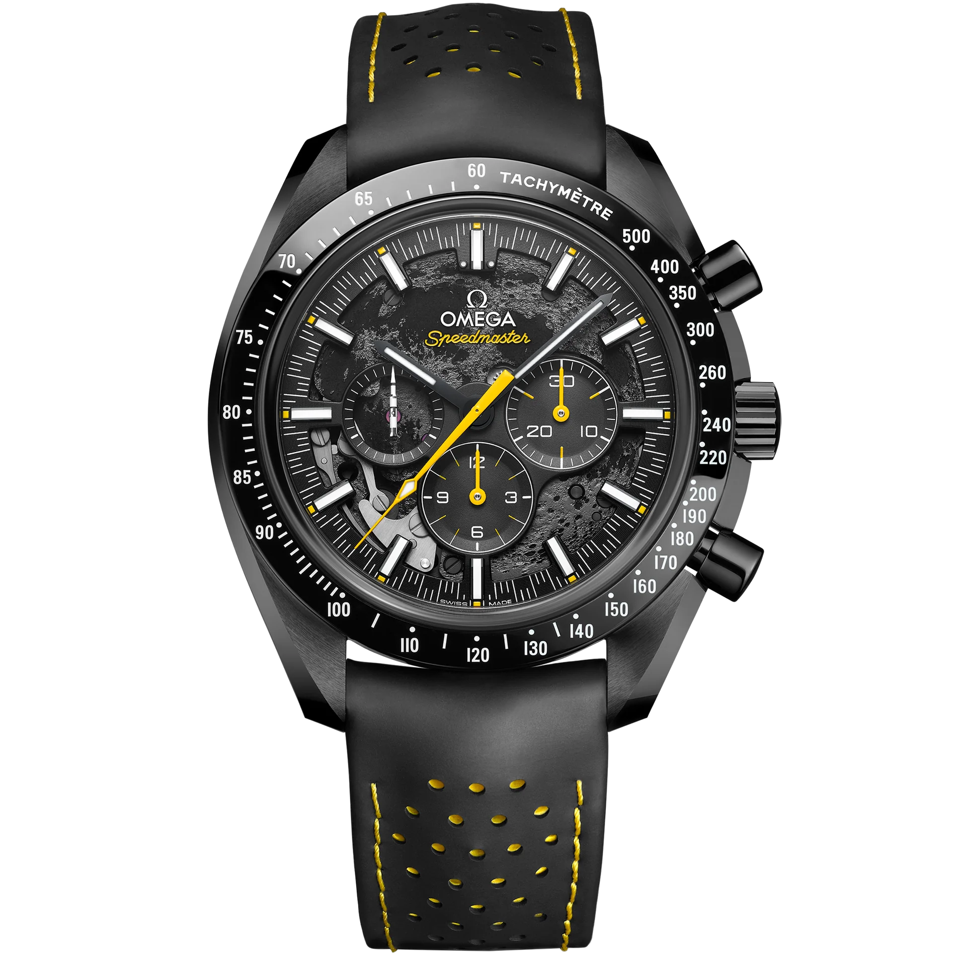 Adorned with a perforated black rubber strap with a yellow interior, this model exudes sophistication, highlighted by a yellow chronograph seconds hand and a laser-engraved tachymeter scale filled with white enamel on the bezel. Its patent-pending small-seconds subdial features a Grade 5 titanium hand shaped like the Saturn V rocket, meticulously crafted with laser techniques to capture intricate textures and colors.