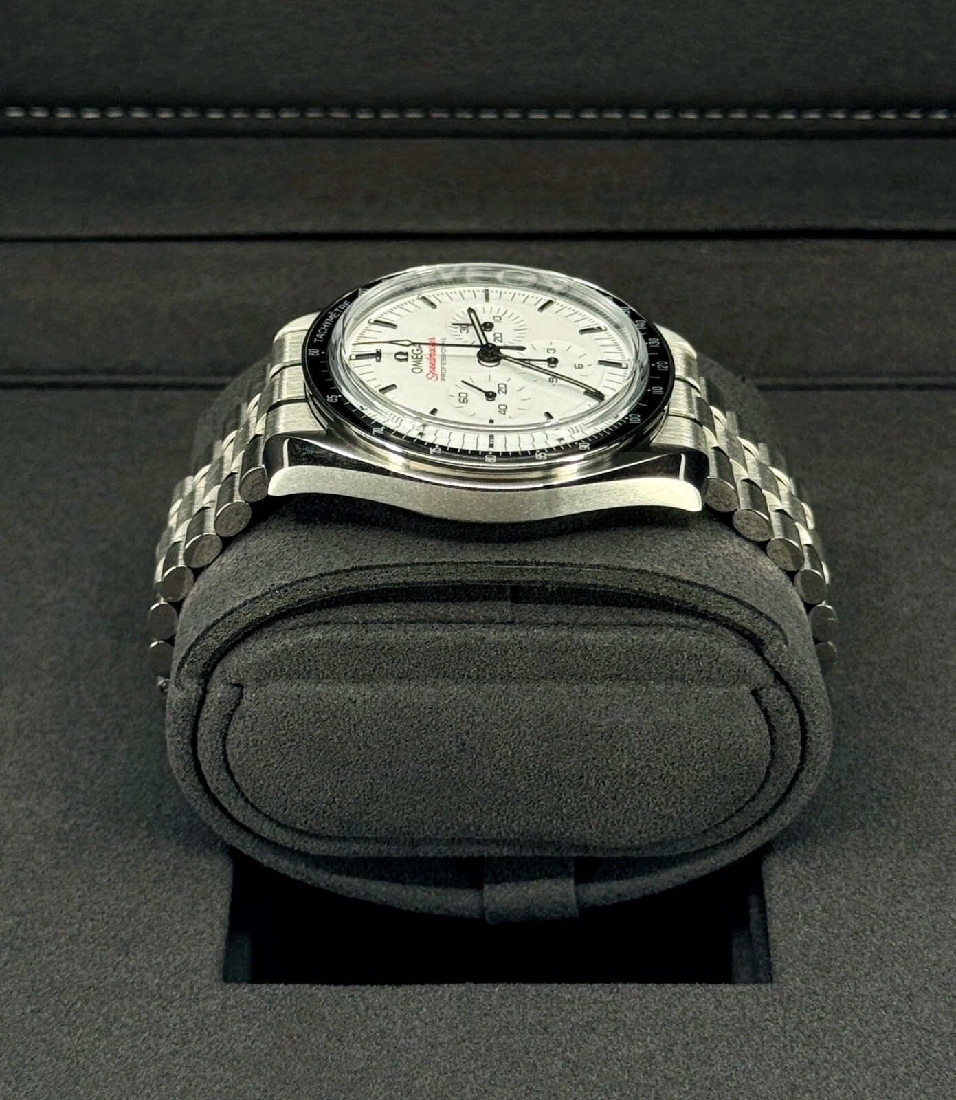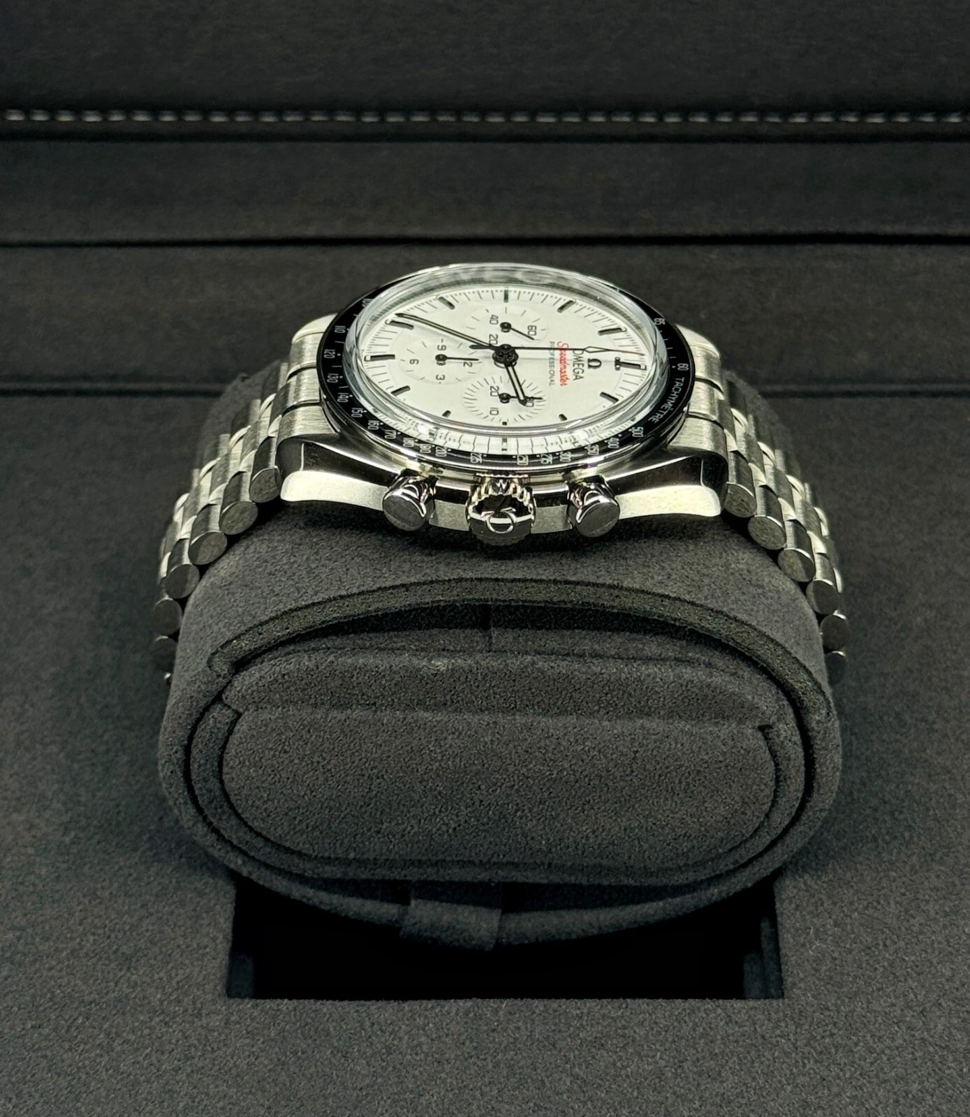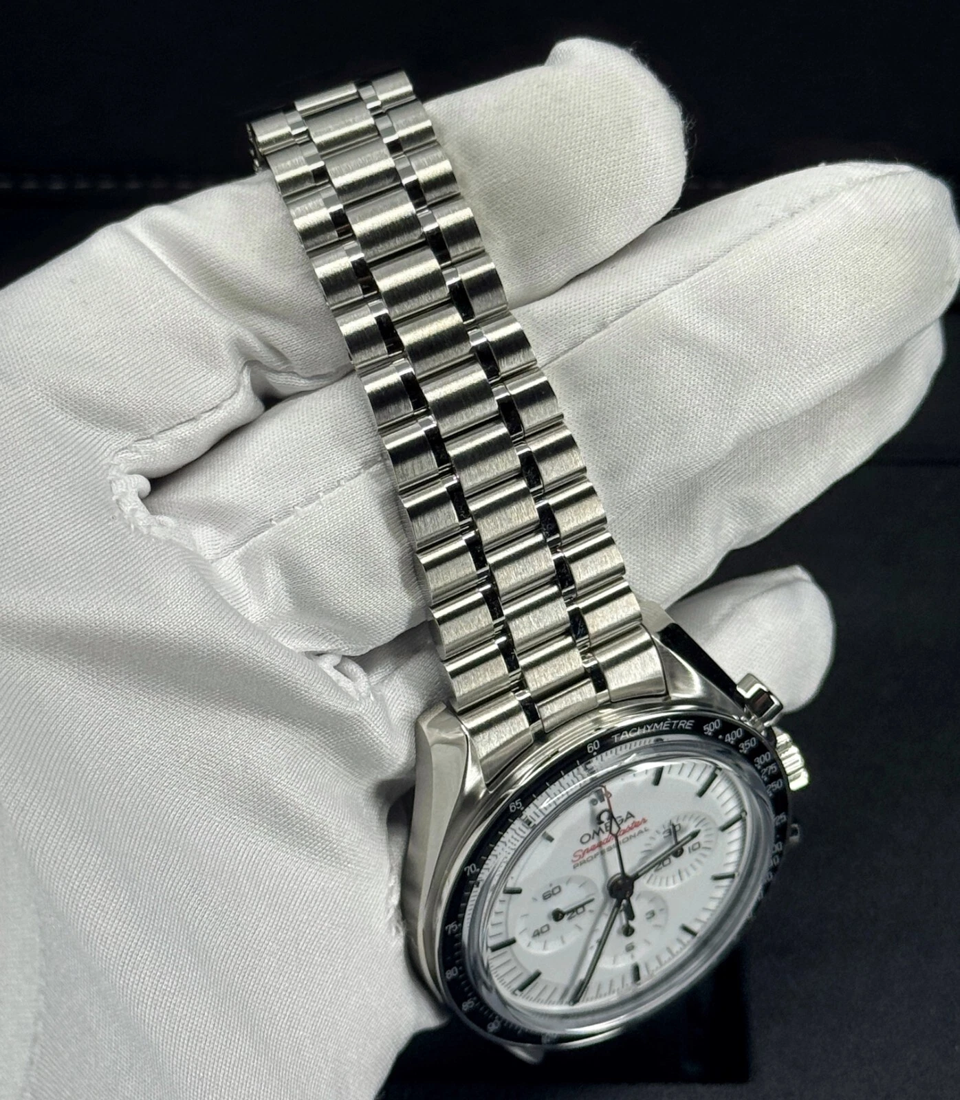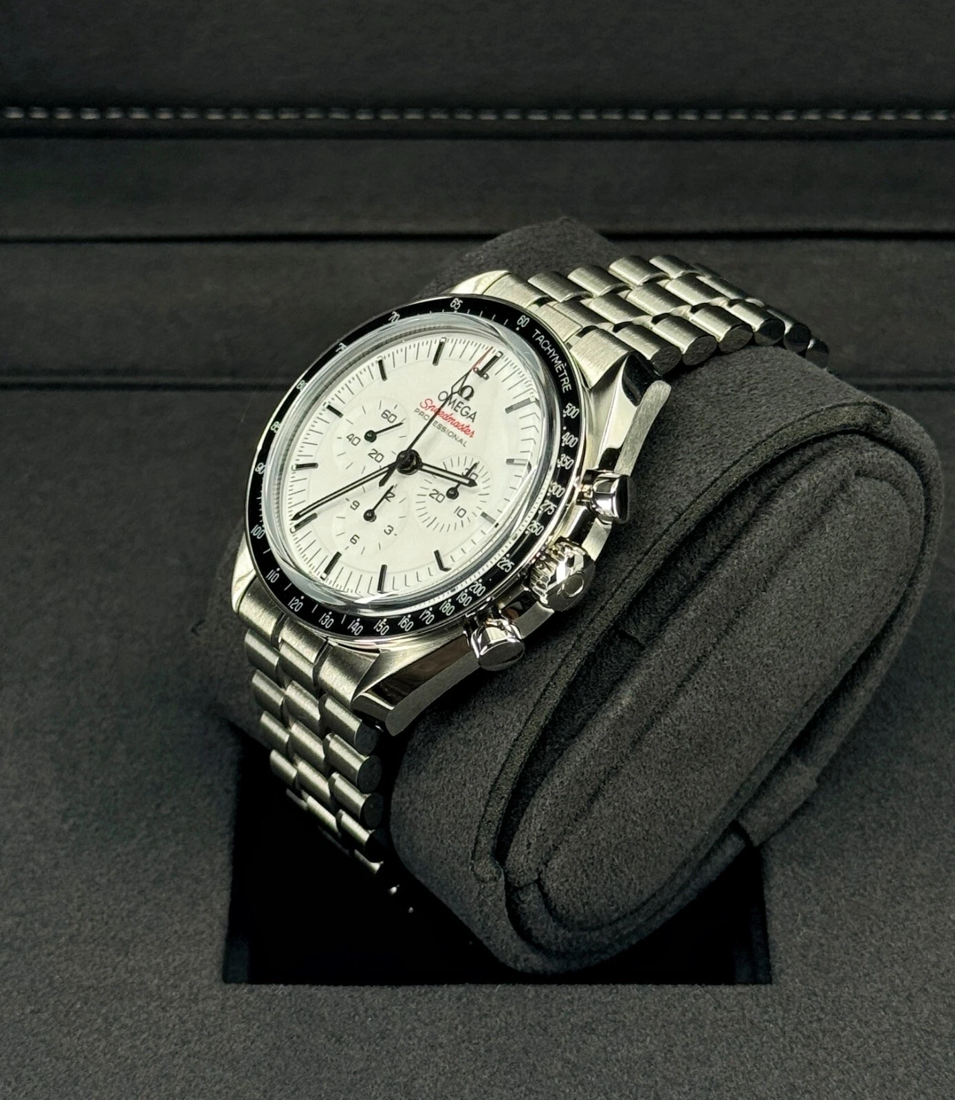The dial’s red accents, including the Speedmaster name and seconds hand tip, draw inspiration from astronaut suits and the ALASKA I watch protective case. The bracelet, featuring a foldover clasp with a comfort setting and adorned with a polished Omega logo, exudes refinement and practicality.