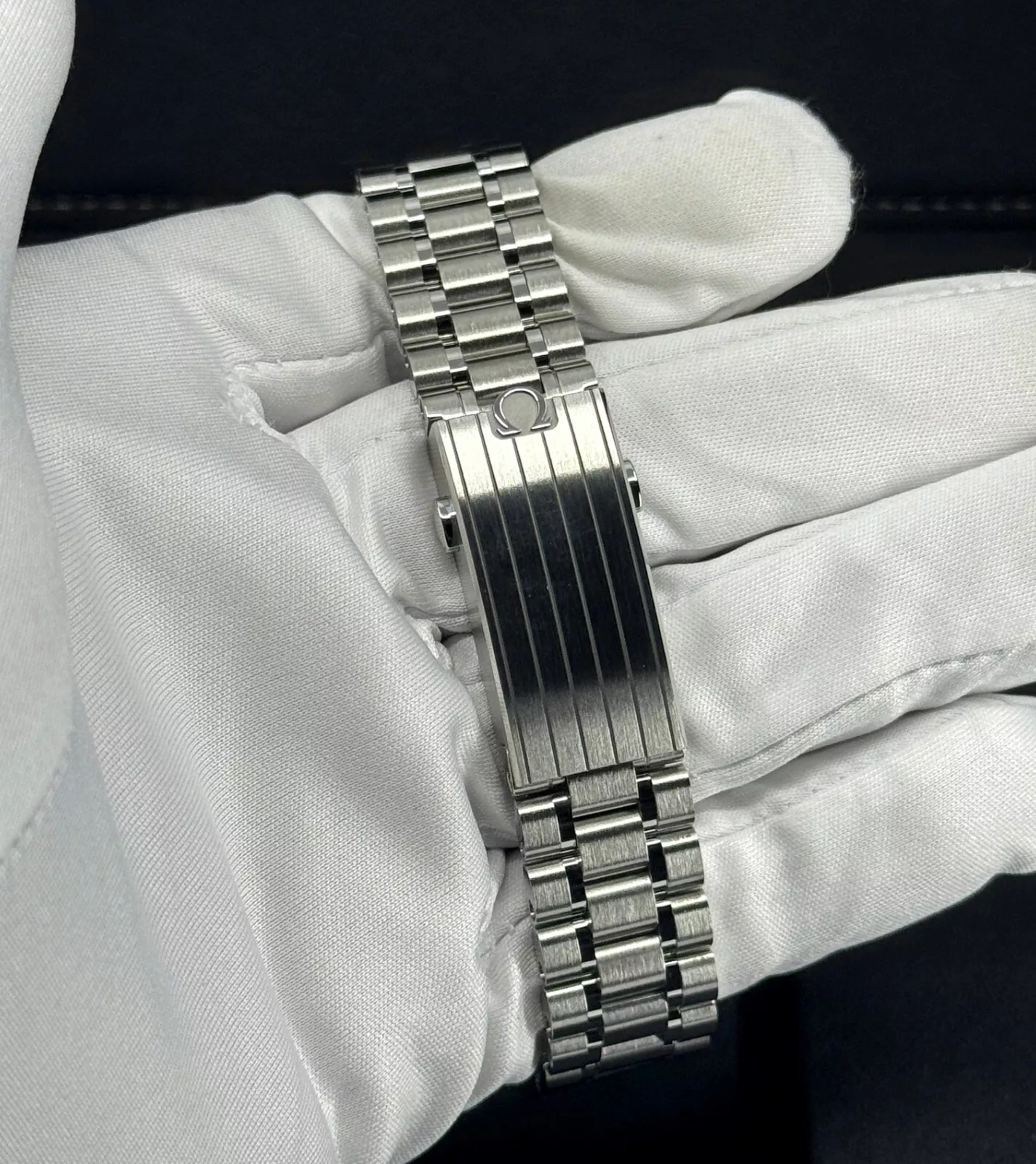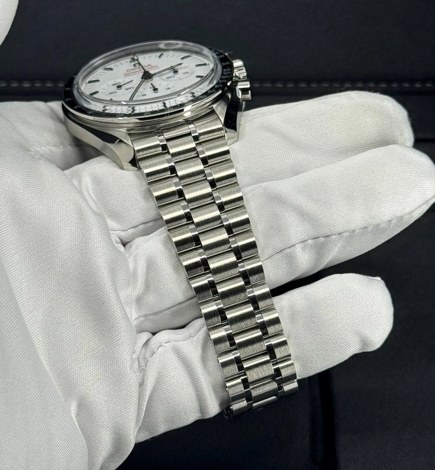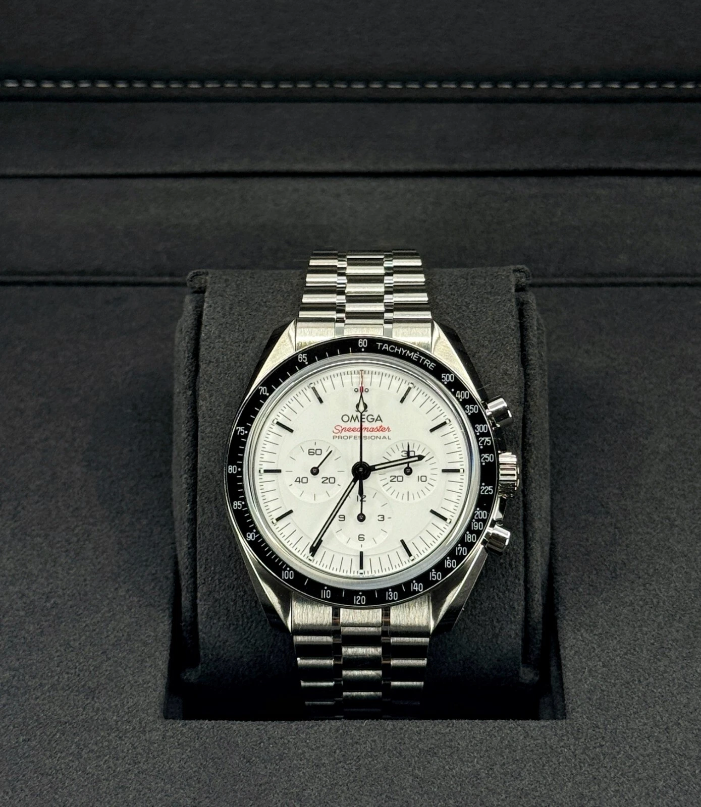 The dial’s red accents, including the Speedmaster name and seconds hand tip, draw inspiration from astronaut suits and the ALASKA I watch protective case. The bracelet, featuring a foldover clasp with a comfort setting and adorned with a polished Omega logo, exudes refinement and practicality.