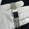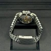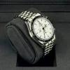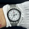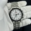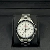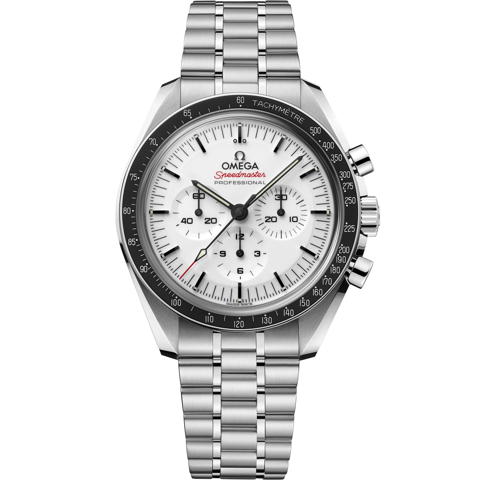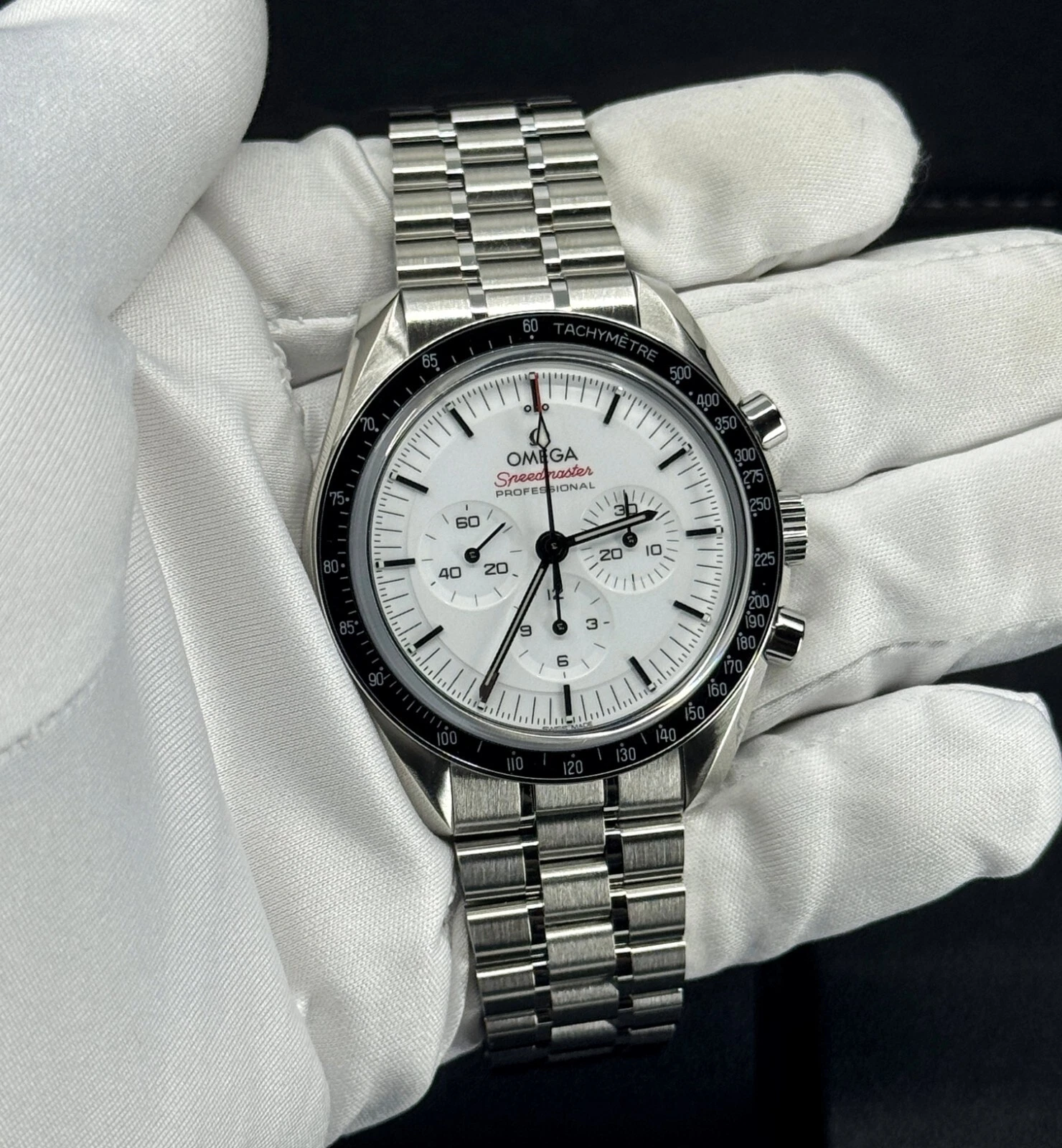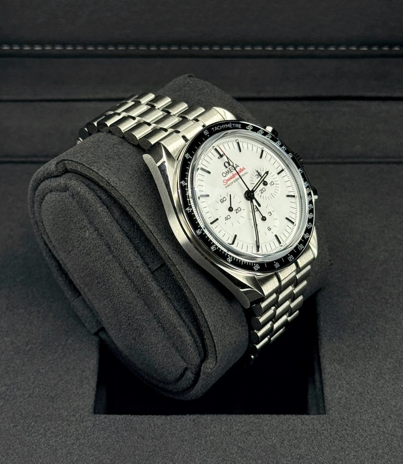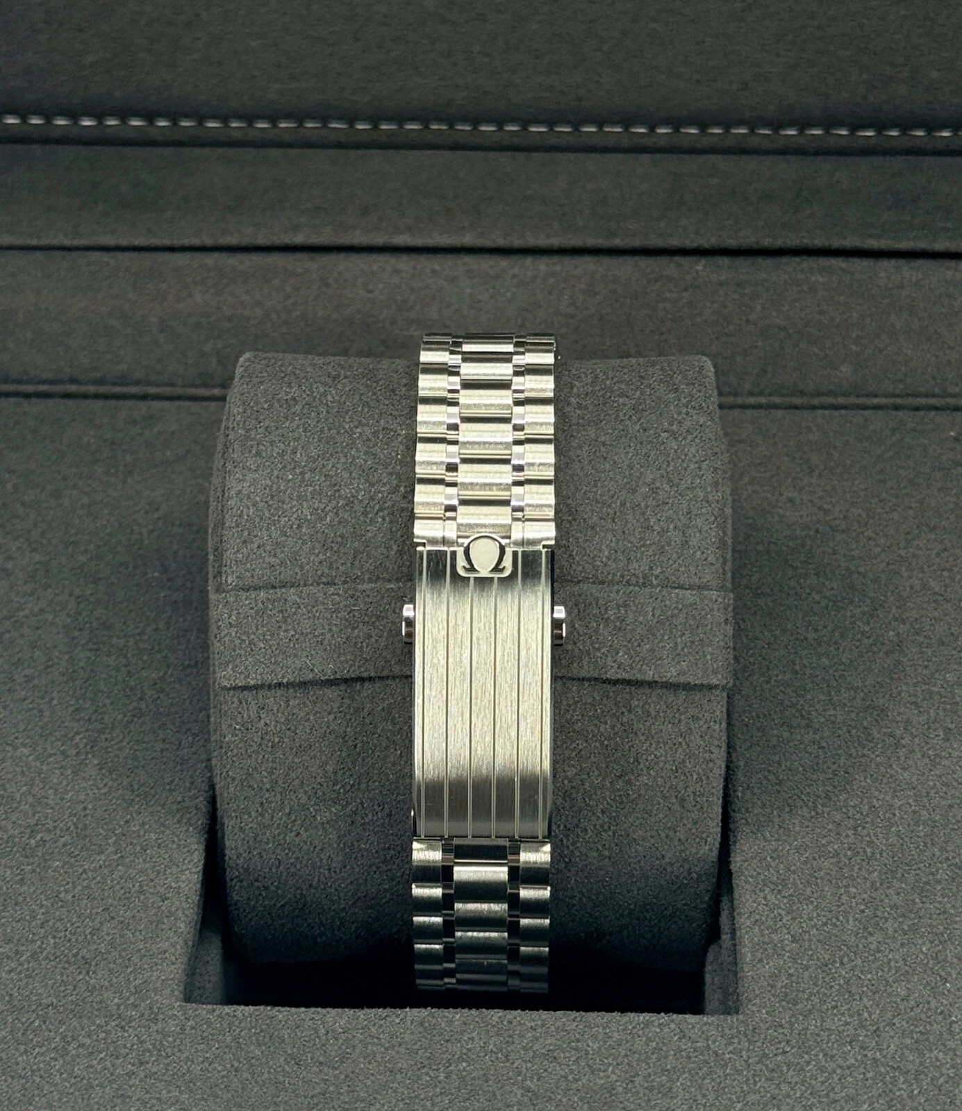 The dial’s red accents, including the Speedmaster name and seconds hand tip, draw inspiration from astronaut suits and the ALASKA I watch protective case. The bracelet, featuring a foldover clasp with a comfort setting and adorned with a polished Omega logo, exudes refinement and practicality.