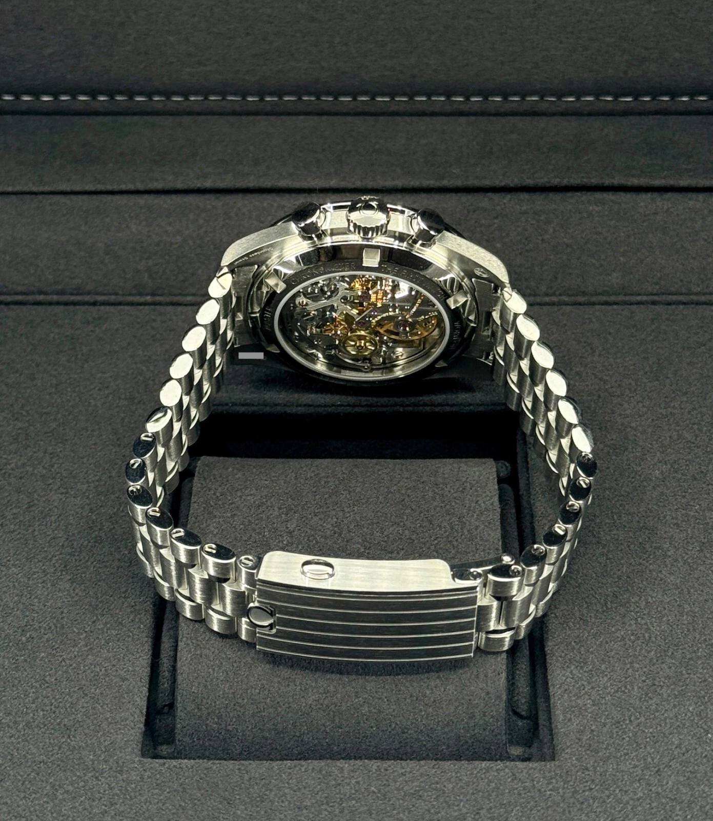 Protected by scratch-resistant sapphire crystal on both front and back, the watch houses the Omega Co-Axial Master Chronometer Calibre 3861. This manual-winding movement, certified by METAS, drives the small seconds sub-dial and chronograph functions with precision. Resistant to magnetic fields up to 15,000 gauss, it ensures accuracy and reliability even in challenging environments.
