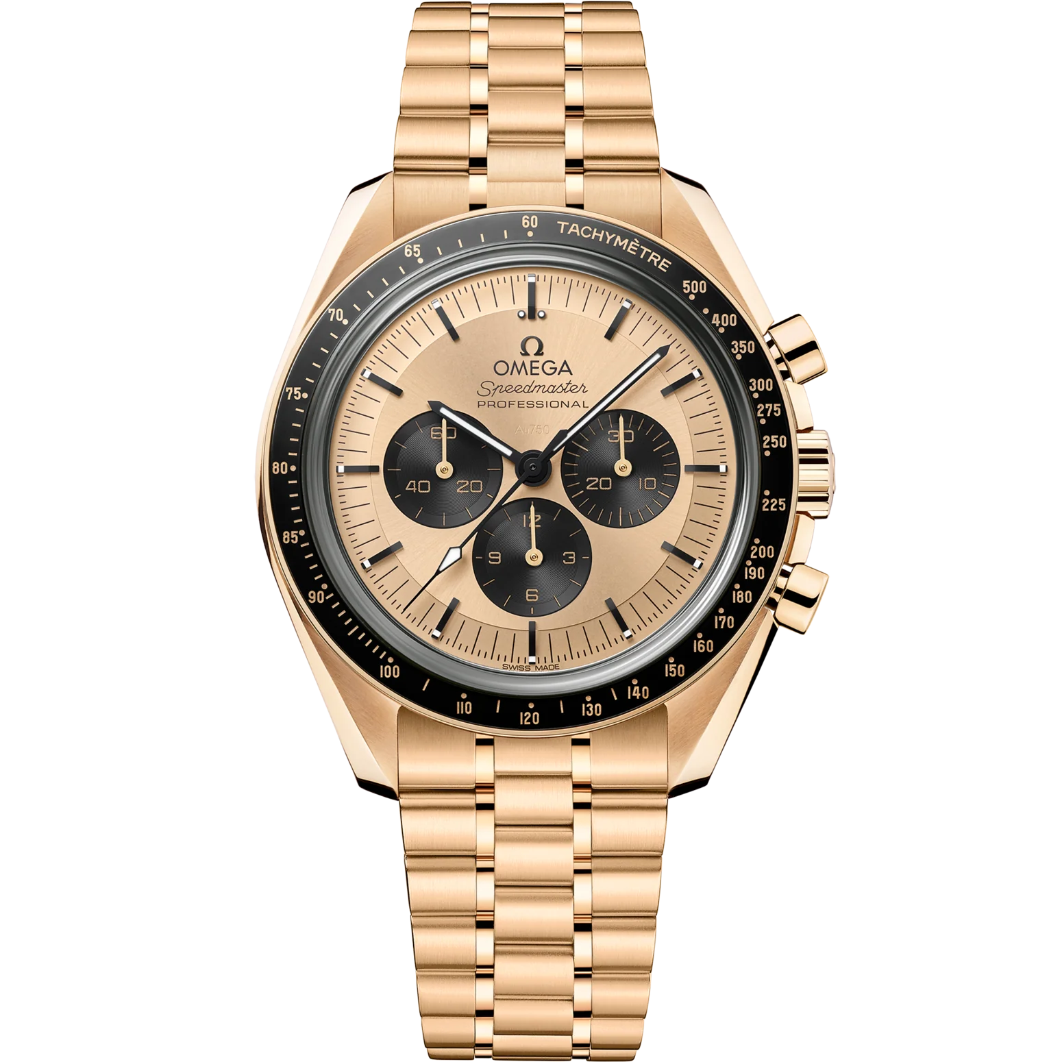 The caseback, also in polished 18K Moonshine™ Gold, bears double bevels and is engraved with the iconic words “FIRST WATCH WORN ON THE MOON” in black. Powering this timepiece is Omega’s Co-Axial Master Chronometer Calibre 3861 with a special luxury finish. It incorporates cutting-edge components, from the Co-Axial escapement for enduring precision to the silicon balance spring for remarkable anti-magnetic properties.