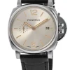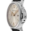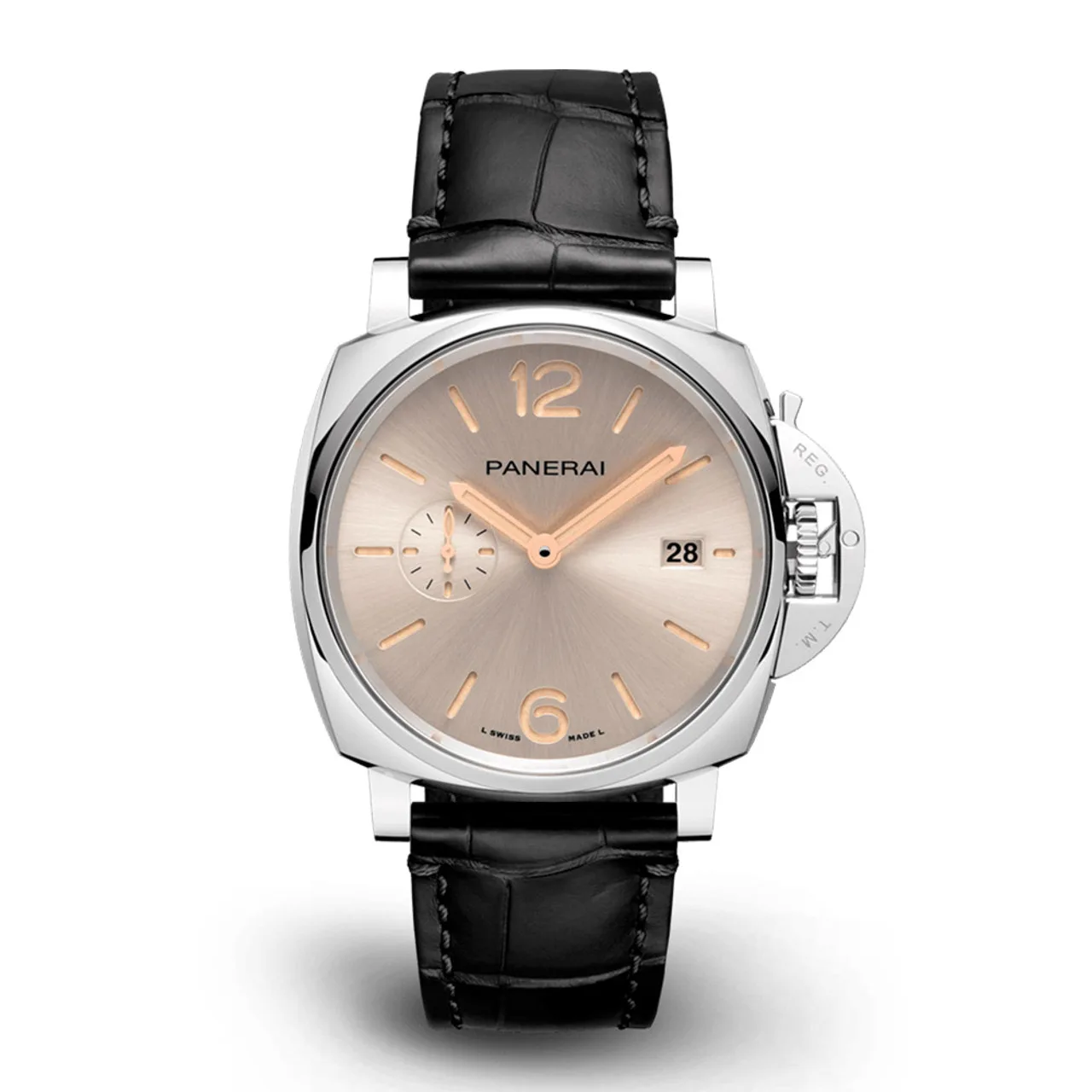 Ivory sun-brushed with luminous Arabic numerals and hour markers. Date at 3 o’clock and small seconds at 9 o’clock.