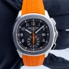 Silver-tone stainless steel case with a black rubber strap. Fixed bezel. Black dial with silver-tone hands and Arabic numeral hour markers. Dial Type: Analog. Date display at the 3 o’clock position. One- 60 minutes subdials. Patek Phillipe Calibre CH 28-520 C automatic movement with a 55-hour power reserve. Scratch resistant sapphire crystal. Screw down crown. Transparent case back. Cushion case shape, case size: 42.2 mm, case thickness: 11.9 mm. Band width: 22 mm. Fold-over clasp. Water resistant at 120 meters / 400 feet. Functions: date, hour, minute, second. Additional Info: comes with interchangeable orange composite strap. Luxury watch style. Patek Philippe Aquanaut Black Dial Automatic Mens Chronograph Watch 5968A-001.