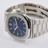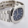 The 5711, Nautilus 40th Anniversary, features a 40 mm case. This is a platinum example with blue dial and platinum bracelet. Functions include date and time.