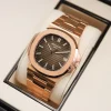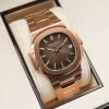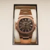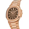 Patek Philippe Nautilus 5711-1R-001 Rose Gold 40mm. The watch has Light/Dark Brown Gradated Dial w/ Golden hands and Fixed Bezel. The Case is Rose Gold w/ Caliber # 26?330 S C w/ 30 Jewels, 45 hours power reserve. The Bracelet is Rose gold with Fold-over clasp. The Water-resistant is up to 120 m. The Watch comes complete with Patek Philippe Papers & Original Patek Philippe Box.