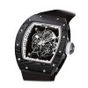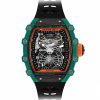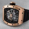 Satin-finished 18-karat rose gold forms the tripartite, tonneau-shaped case of the RM 035 Gold Toro. The timepiece’s crown, buckle and hands are also crafted in the precious metal. Presented on a black rubber strap with matching crown protector, the watch’s skeletonized movement is visible from the front and back thanks to its sapphire caseback. The RM 035 Gold Toro is a numbered, 50-piece limited edition, and is available exclusively at Richard Mille retailers throughout the Americas.