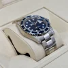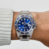 The vibrant blue lacquered dial is accented with Chromalight-filled hour markers and Mercedes-style hands for optimal legibility underwater or on land. A date display at 3 o’clock, magnified by the Cyclops lens, adds practical utility to its opulent design.