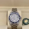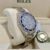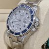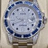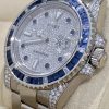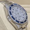 Rolex Submariner Automatic Chronometer Saphire Set Diamond Watch 116659SABRO18kt white gold case with a silver-tone 18kt white gold bracelet, Blue diamond set bezel. Pave dial with index hour markers, Minute markersaround the outer rim. Dial Type: Analog. Luminescent hands and markers. Date display at the 3 o’clock position, Rolex Calibre 3135 Automatitmovement, containing 31 jewels, bitting at 28800 vph, and has a power reserve of approximately 48 hours, Sratch resistant sapphire crystalScrew down crown, Solid case back, Round case shape, case size:40 mm, Ovsterlock clasp, Water resistant at 300 meters / 1000 feet Functionsdate, hour, minute, second, chronometer. Submariner Series. Dive watch style. Watch label: Swiss Made. Rolex Submariner AutomaticChronometer Saphire Set Diamond Watch 116659SABRO
