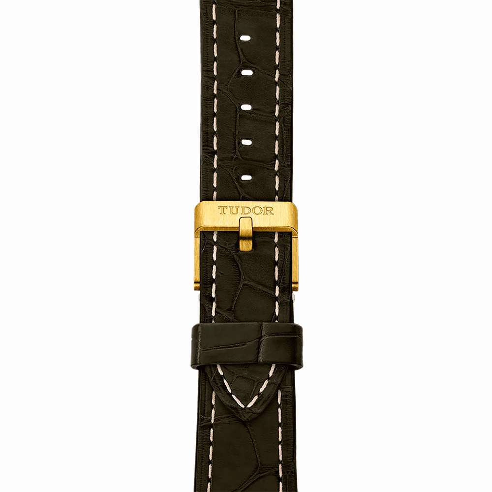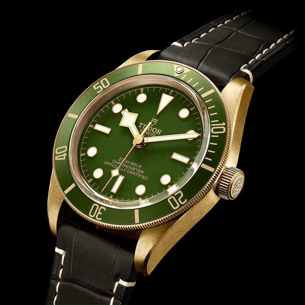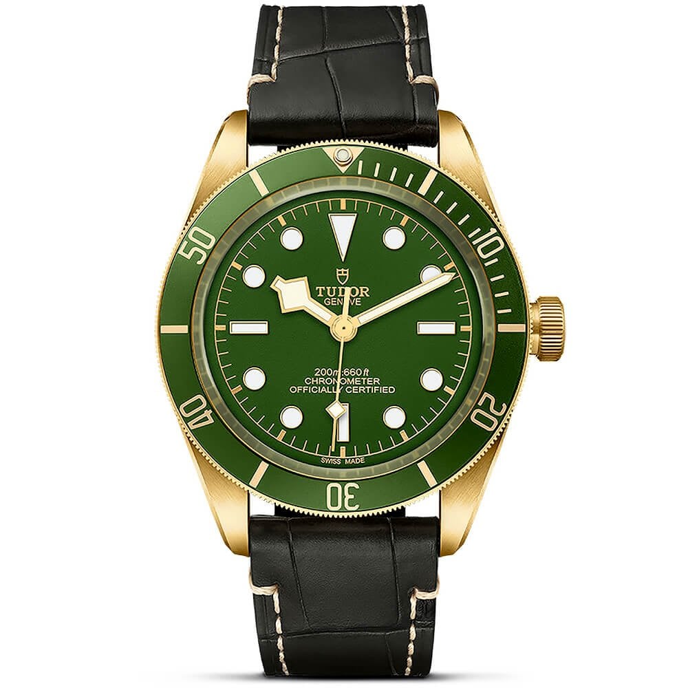 Since its introduction in 2018, the Black Bay Fifty Eight watch from Tudor has proved a popular collector’s timepiece. One distinct model started the collection which has now grown vastly into a versatile range of diver’s watches, some of which are presented in unusual colours like this stunning Tudor Black Bay Fifty Eight watch with a green-domed dial. The surface of the display is protected via a domed sapphire crystal glass front, while the hour markers and central hands have been given a generous helping of Super-LumiNova to assist with timekeeping in the dark. The 39mm case of this men’s Tudor Black Bay watch is crafted from satin-finished 18ct yellow gold and is integrated with 200-meter water resistance. A screw-down case and screw-down crown engraved with the Tudor emblem both help to assist with this impressive water resistant housing, which holds an automatic movement at its centre. The Tudor manufacture Calibre MT5400 is a self-winding engine that is built from the ground up inside Tudor’s manufacturing facilities, it provides a staggering 70-hour power reserve and puts its beautiful finishes and arrangement on show behind a sapphire crystal glass caseback. With a unidirectional rotating bezel crafted from green anodised aluminium and featuring a 60-minute dive scale – elapsed time can be measured effectively whilst underwater. The Tudor Black Bay Fifty Eight watch is completed on a dark brown alligator leather strap, attaching into place with a matching 18ct yellow gold buckle.