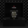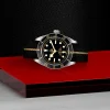 A black and beige fabric strap completes this diver’s watch, donating a sporty look to the wrist. The strap wraps around the arm with a refined buckle. A screw-down winding crown is executed with the Tudor rose logo in relief upon its surface, along with a satin-brushed steel winding crown tube.