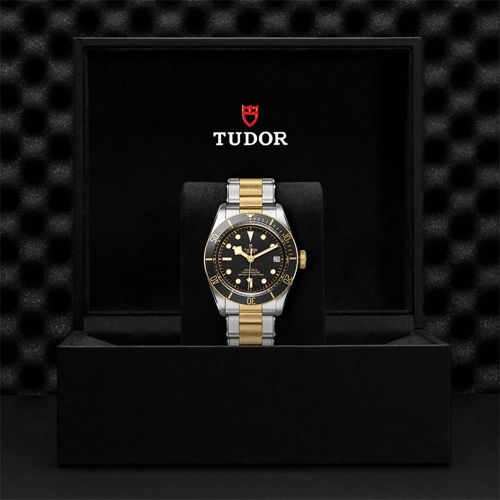 Clothed in black, gold and silver tones, this Black Bay S&G watch from Tudor creates a huge presence on the wrist thanks to its broad 41mm diameter and distinguished chiselled physique. The case of the watch is crafted from 18ct yellow and stainless steel, complete with a matching bi-colour bracelet that secures comfortably to the wrist with a folding clasp. The black dial which lies inside a unidirectional rotating bezel crafted from 18ct yellow gold (with a matt black anodised aluminium insert adorned with gold markings) Features luminous hour markers and chunky central hands for enhanced readability. A date aperture is located at 3 o’clock, enabling the wearer to keep on track of the days of each month. This men’s Tudor Black Bay S&G watch is equipped to withstand 200-meter water resistance and houses the impeccably crafted Caliber MT5612 at its centre. The self-winding movement is COSC-certified and produces a power reserve of 70 hours. Lastly, a domed sapphire crystal glass lens protects the surface of this gent’s Tudor watch. Equipped with anti reflective and scratch resistant technology, the lens can grant a clear view into the dial of the watch at any given point throughout the day or night.