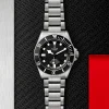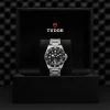 TUDOR combines legible aesthetics with a lightweight design in this Pelagos watch. A stealthy black dial Features white indexes, offering a clear and visible layout at a glance. A date aperture is located at 3 o’clock, positioned underneath a sapphire crystal glass lens integrated with anti reflective and scratch resistant properties. The 500 meter water resistant TUDOR diver’s watch is crafted from a titanium case for a lightweight feel upon the wrist. It matches a satin brushed titanium bracelet with a folding clasp and additional TUDOR patented diver’s extension facility for wearing over the top of heavy diving gear.