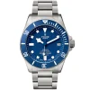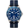 The Tudor Marine Nationale Pelagos FXD watch is designed for underwater navigation and optimised for professional use. The FXD in its name refers to the extra robust fixed strap bars on the case, designed to revive Tudor’s historic collaboration with the French Navy, the Marine Nationale. This men’s Tudor Pelagos FXD watch measures a confident 42mm diameter and has been crafted from titanium for a lightweight finish against the wrist. Equipped with 200-meter water resistance and topped with a sapphire crystal glass front, the Tudor Pelagos watch is 12.75 thick and boasts a satin-brushed finish. The case houses the in-house manufactured and COSC-certified Calibre MT5602 at its centre, which provides an impressive 70-hour power reserve. Its key Features are a bidirectional rotating bezel and stylish navy blue and light blue striped NATO-style strap that Features a self-gripping fastening system. The watch also comes with an additional complimentary strap in navy blue rubber with a woven motif and a light titanium buckle. The bezel Features a 60-minute retrograde graduation for navigation by successive stages, whilst the screw-down crown at 3 o’clock on the case boasts the Tudor shield in relief.