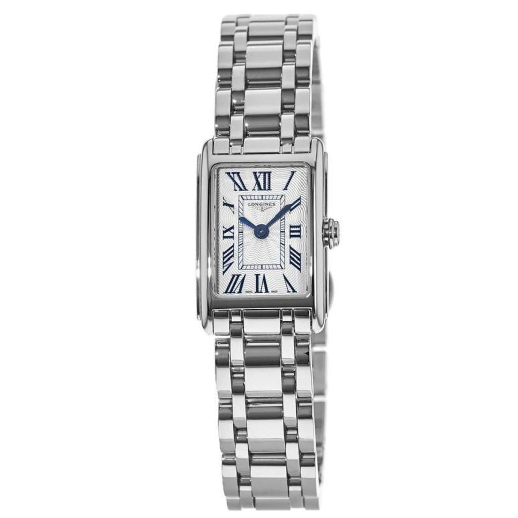 Bracelet. case. bezel. dial with Blue hands and Roman Numeral hour markers. . movement. crystal. 17.7 mm x 27 mmmmx 17.7 mm x 27 mmmmx 7.5mm case. 13mm band width. water resistant. L5.258.4.71.6 Brand Longines Gender Female Model L5.258.4.71.6 Series DolceVita Movement Quartz Water Resistant 30 Meters Band Material Bracelet Band Color Silver Band Width […]