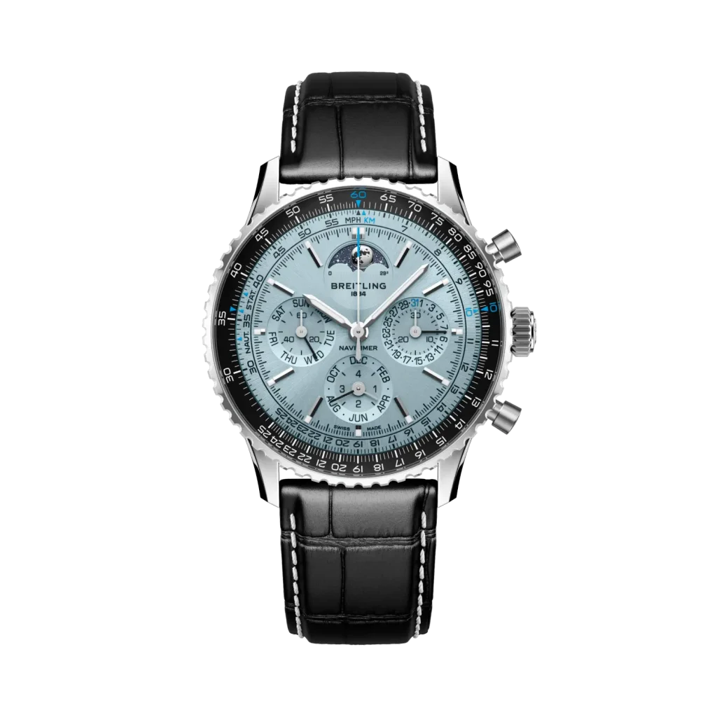 SPECIFICATIONS Movement Caliber: Breitling Manufacture Caliber B19 Winder: self-winding mechanical, bidirectional with ball bearing Power reserve: approximately 96 hours Jewels: 39 Balance frequency: 28,800 a/h or 4 hertz Chronograph: 1/4th second, 30 minutes, 12 hours Display: Perpetual calendar with moonphase, hour, minute, second Certification: COSC-certified Case Material: stainless steel with platinum rotating bezel Diameter: 43 […]