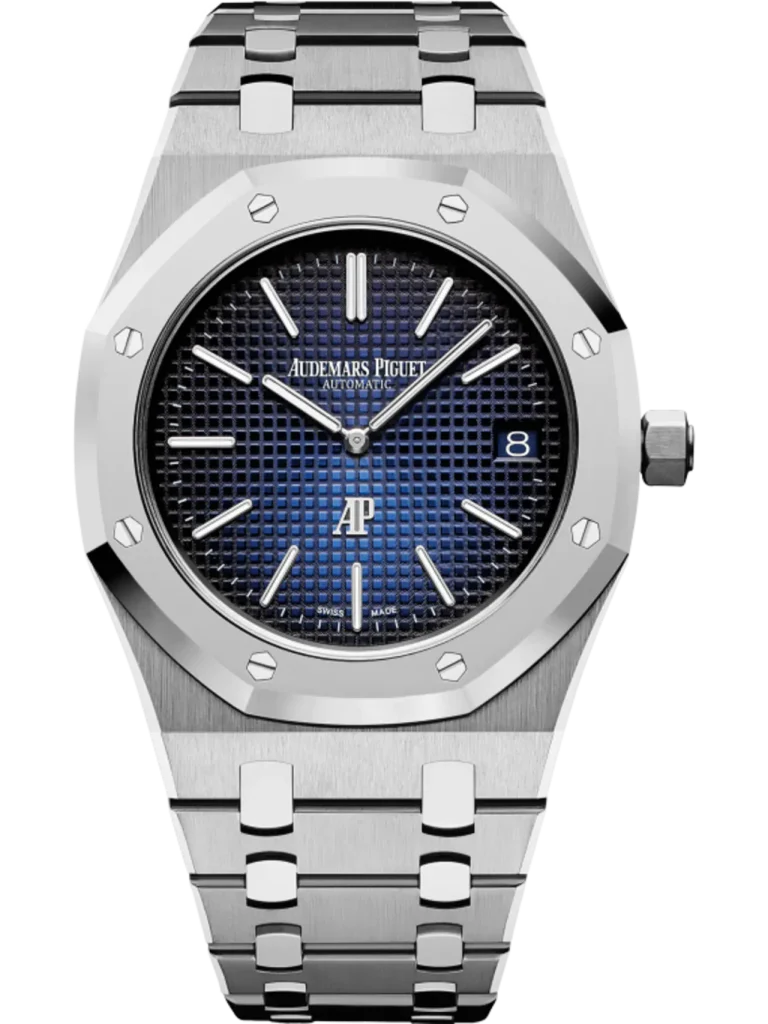 Audemars Piguet Oak Extra?Thin Stainless Steel blue dial Watch 15202ST.OO.1240ST.01, 39 mm stainless steel case, 8.1 mm thick, glare-proofed sapphire crystal back, glare-proofed sapphire crystal, blue dial with Petite Tapisserie pattern, white gold applied hour-markers and Royal Oak hands with luminescent coating, Manufacture Calibre 2121 selfwinding movement with hours, minutes, date, approximately 40 hours of […]