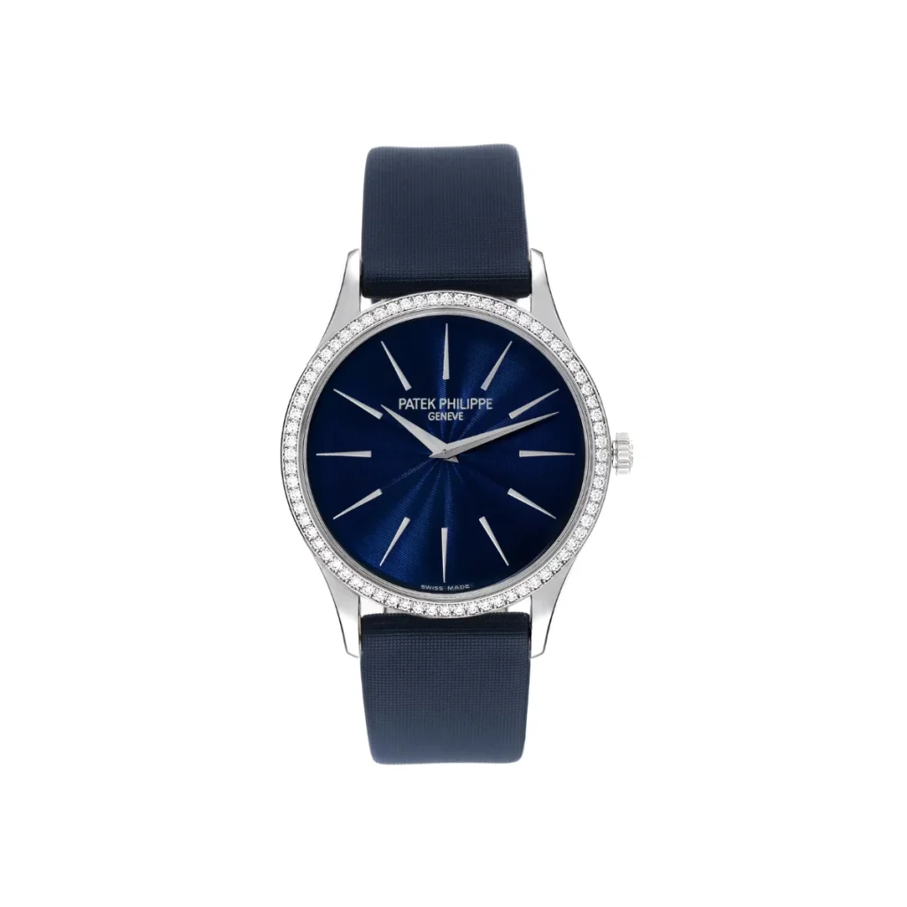Water Resistance: 30 m Bracelet Color: Blue Dial: Blue Dial Numerals: No Numerals Bezel Material: White Gold / Diamonds Case Material: White Gold Case Size: 33 mm Movement: Manual Winding Clasp: Pin Buckle Bracelet Material: Satin Condition: Mint / Like New (95%) Gender: Women Brands: Patek Philippe Year: 2019 Completeness: Box & Papers