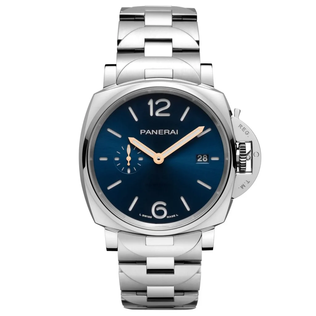 TECHNICAL DETAILS MOVEMENT Automatic mechanical, P.9010 calibre, 13¾ lignes, 6.0 mm thick, 31 jewels, Glucydur® balance, 28,800 alternations/hour. Incabloc® anti-shock device. Power reserve 3 days, two barrels. 200 components FUNCTIONS Calendar aperture , Hours , Small seconds , Minutes BezelPolished Panerai Goldtech™ CASE Diameter 44mm, brushed Panerai Goldtech™BackSee-through sapphire crystalDialBlue sun-brushed with luminous Arabic numerals […]