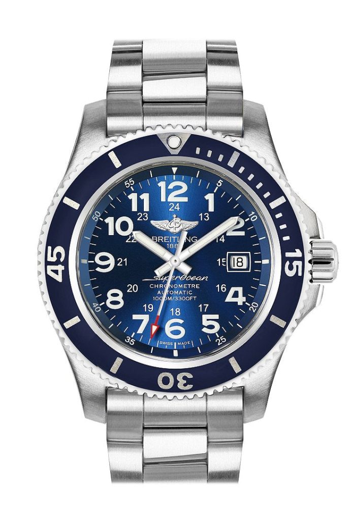 MOVEMENT Caliber: Breitling 17 Movement: Self-winding mechanical Power reserve: Approx. 38 hrs Vibration: 28,800 v.p.h Jewel: 26 jewels CASE Case material: Stainless steel Caseback: Screwed in Water resistance: 300 m (1,000 ft) Bezel: Unidirectional, ratcheted Crown: Screw-locked, two gaskets Crystal: Cambered sapphire, glareproofed both sides DIMENSIONS Product Weight (Approx.): 140.0 g. Watch-head Weight (Approx.): 89.6 […]